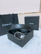 DOUBLE C BELT 38MM IN BLACK QUILTED LAMBSKIN SILVER OVAL BUCKLE CENTERED BLACK LOGO