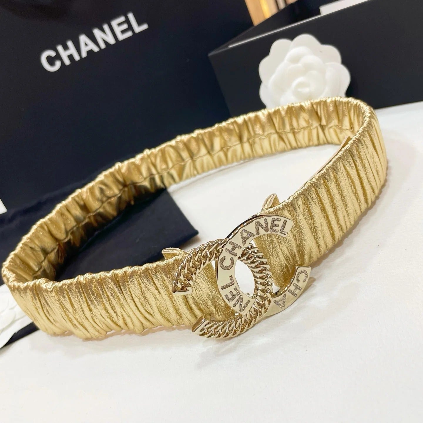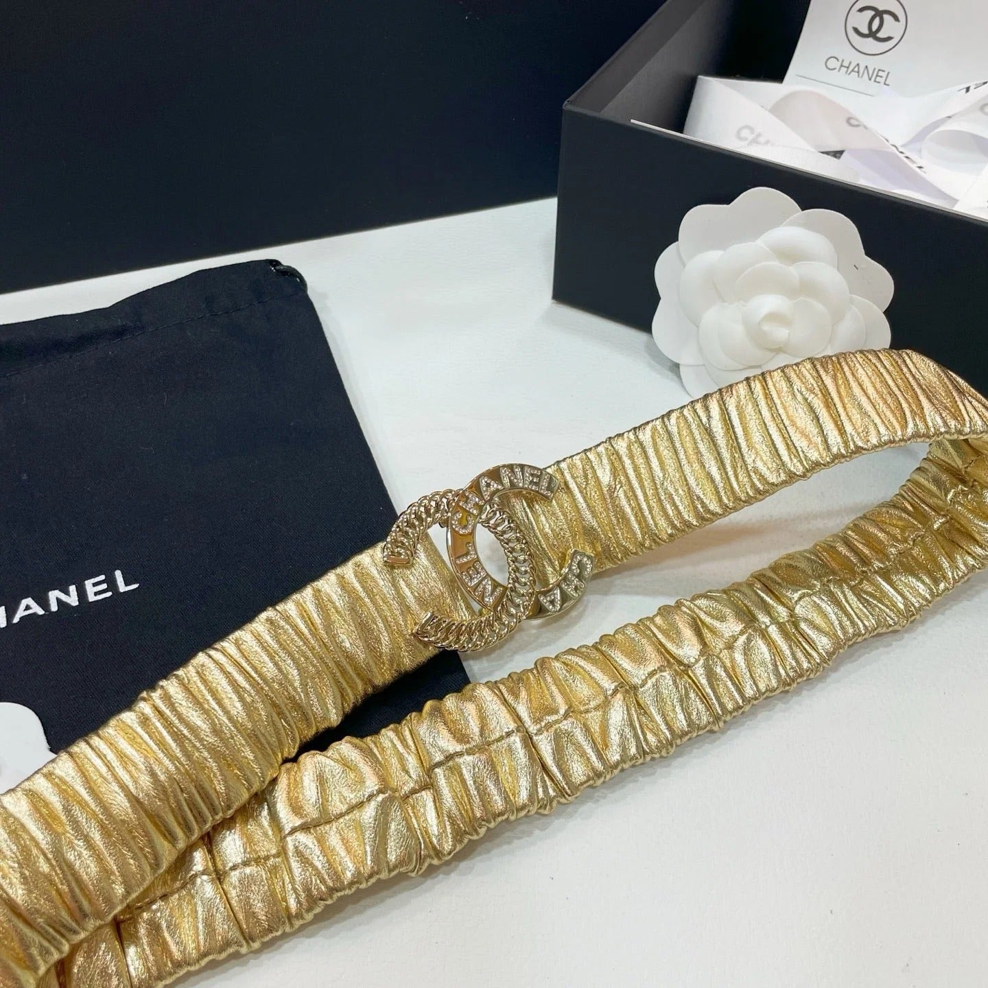 DOUBLE C ELASTIC BELT 30MM IN YELLOW CALFSKIN GOLD CRYSTAL EMBELLISHED BUCKLE