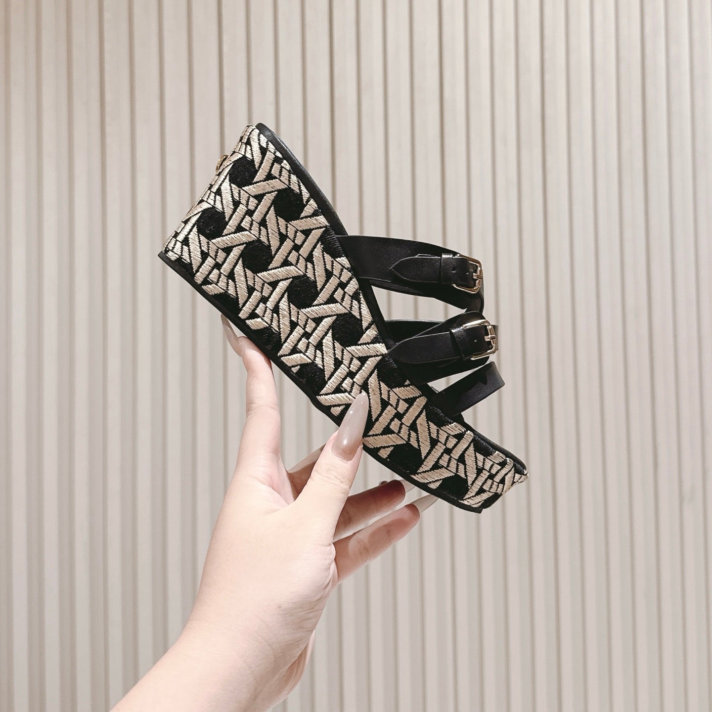 CD Dway Wedge Sandal 85mm Black Calfskin and Embroidered 483078