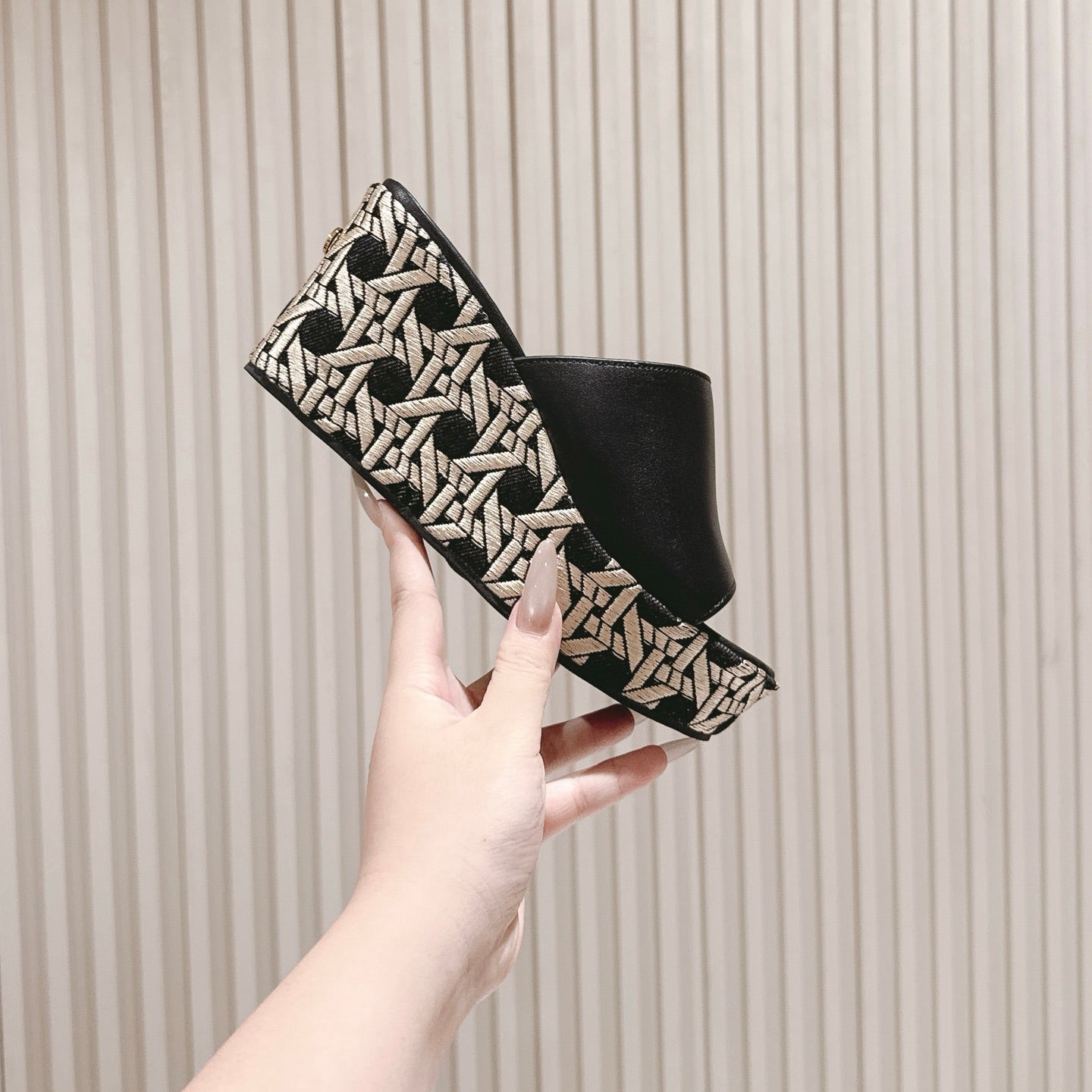 CD L'Amazone Wedge Slide 85mm Black Calfskin and Raffia 483084