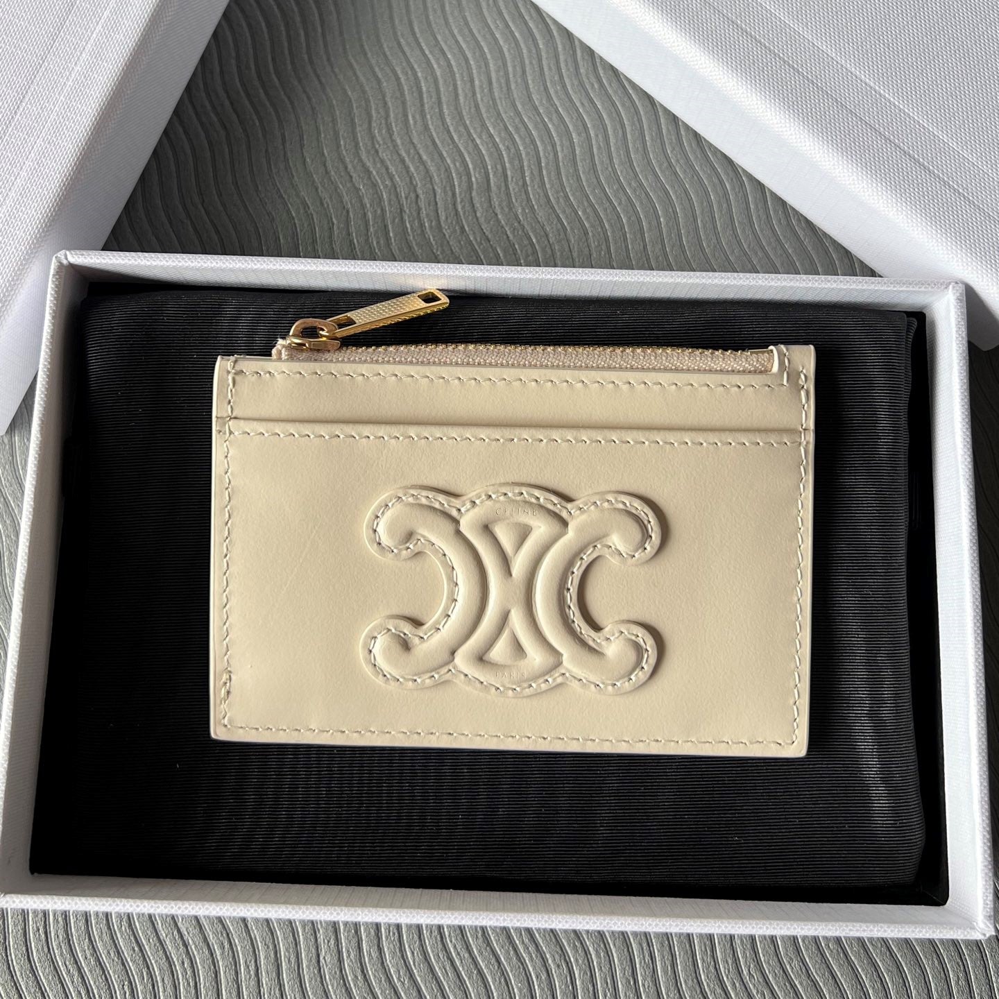 TRIOMPHE Zipped Card Holder Beige Cowhide Leather