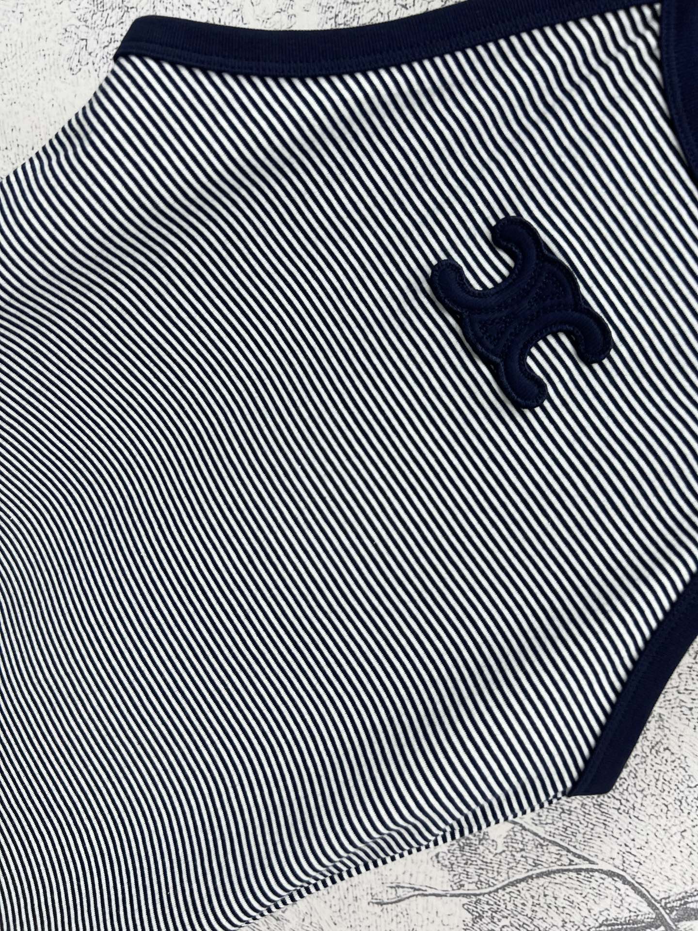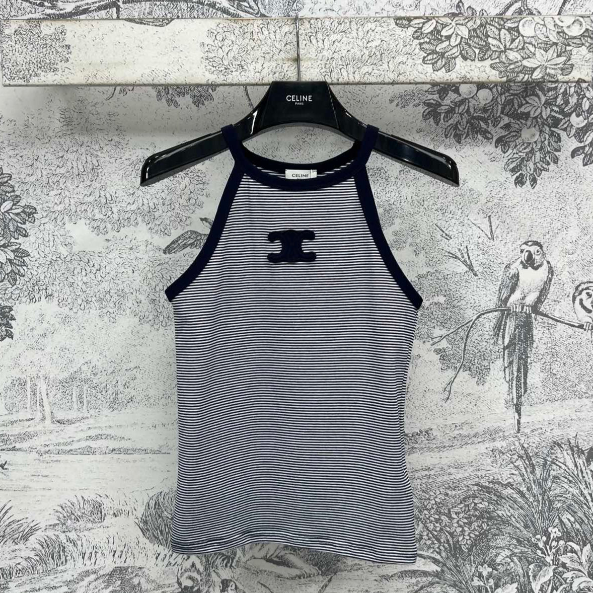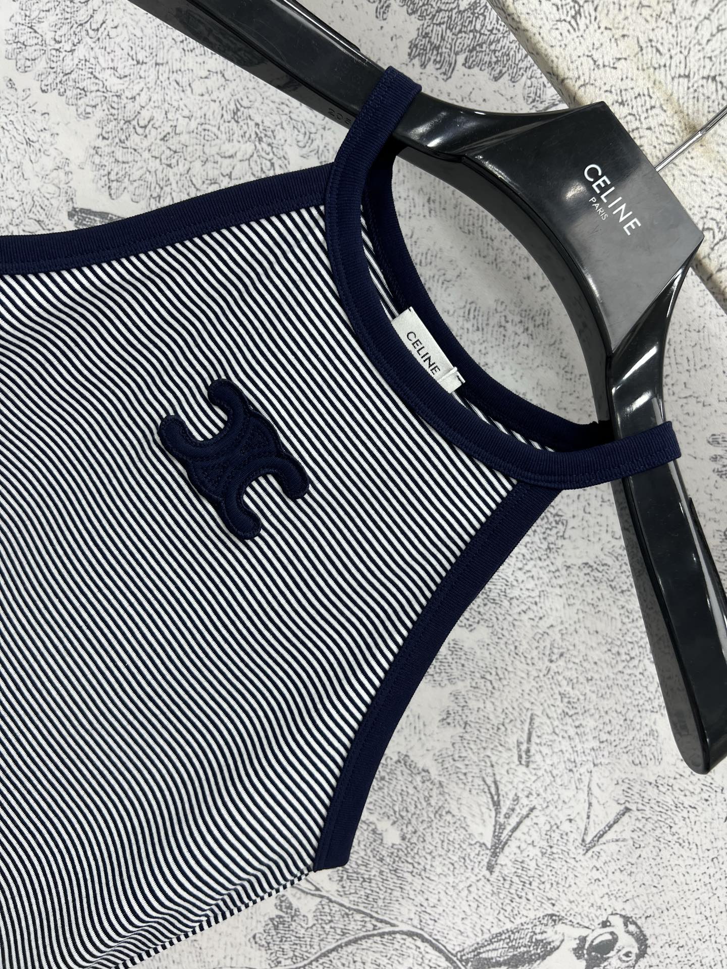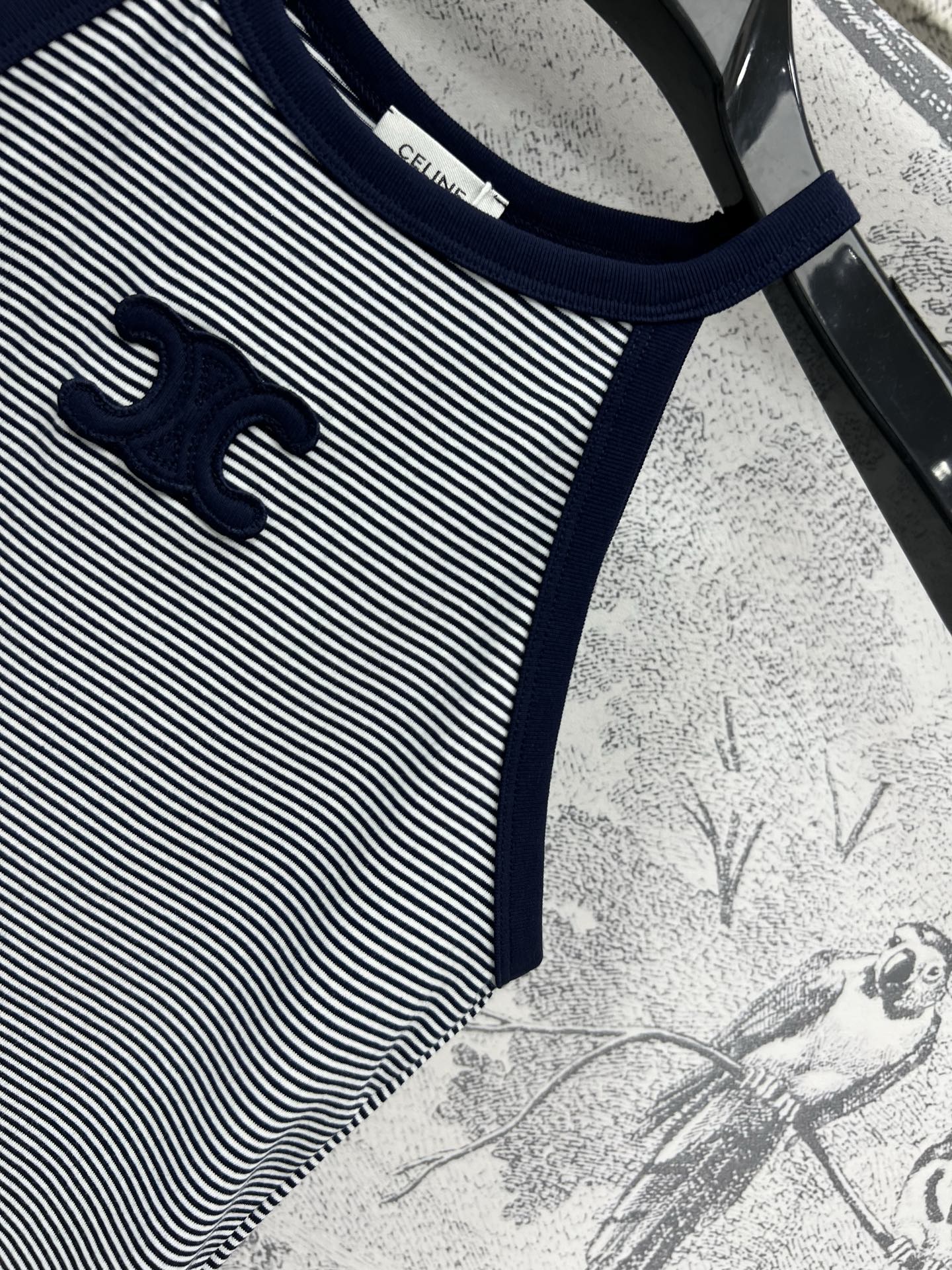 Celine 25 Embroidered Logo Striped Small Vest Navy Blue mix White Cotton