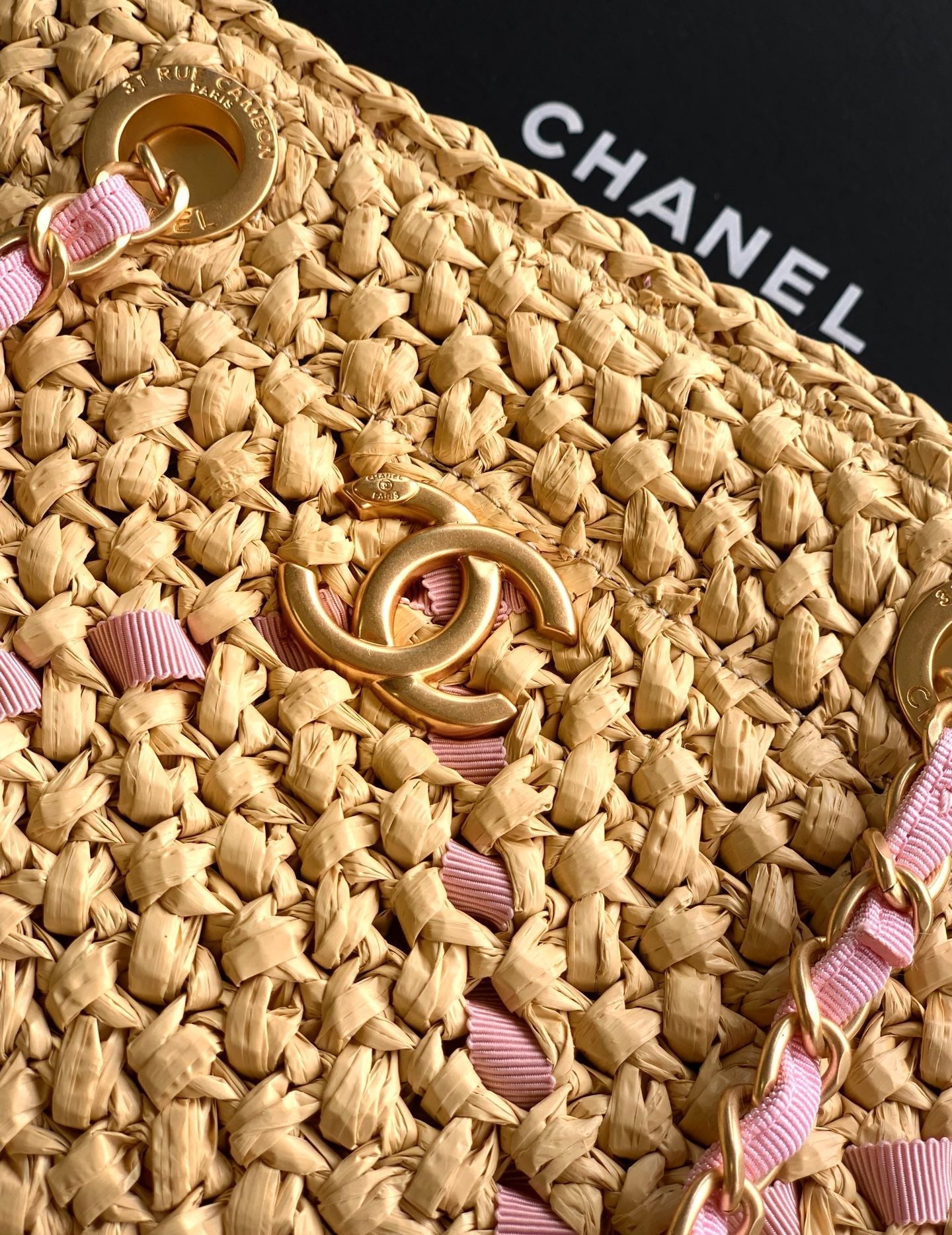 CC Logo Shopper Bag With Chain 23cm Beige Pink Raffia GHW