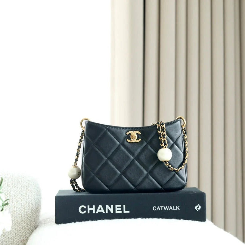 CHANEL 25S HOBO BAG 19.5 CM IN BLACK CALFSKIN WITH GOLD HARDWARE