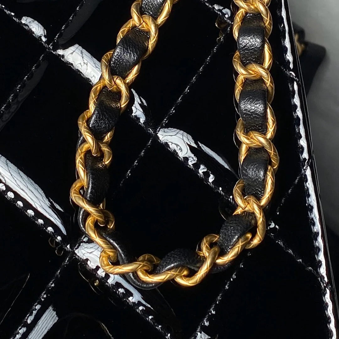 CC 25S FLAP BAG 21 CM IN BLACK PATENT LAMBSKIN WITH TOP HANDLE