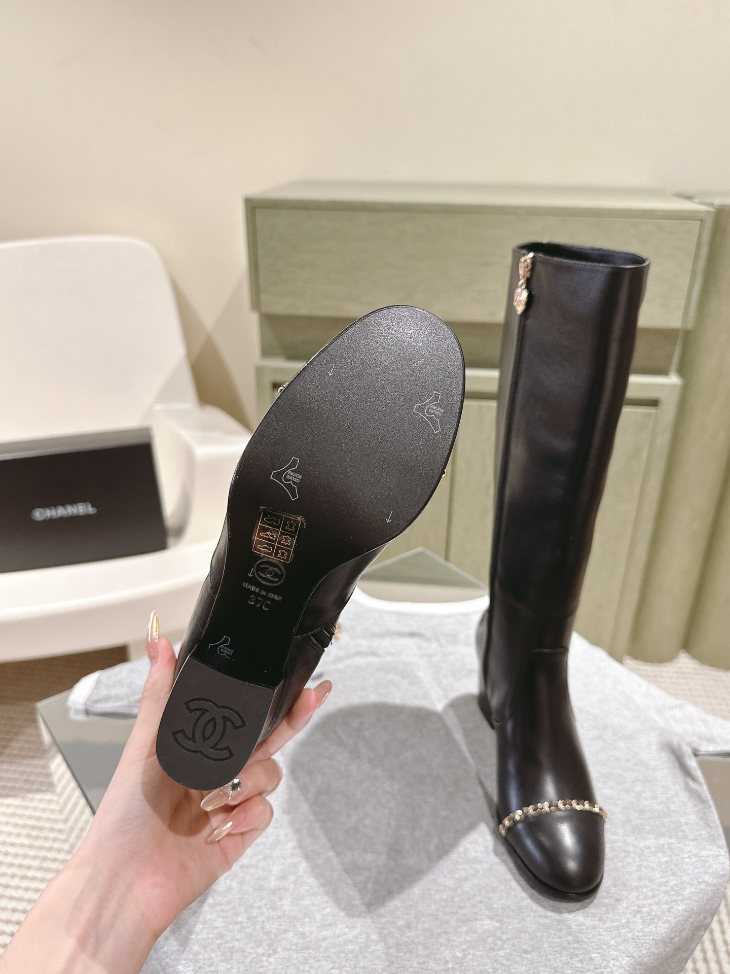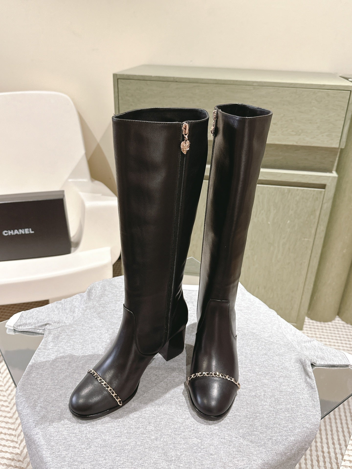 CC 24 FW Knee-High Boots with Chain 70mm Black Cowhide 447186