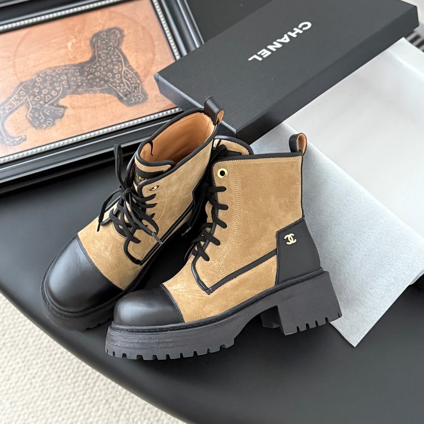 CC 25B Atelier Flats Boots Shoes Black Light Brown Sheepskin & Suede 458765
