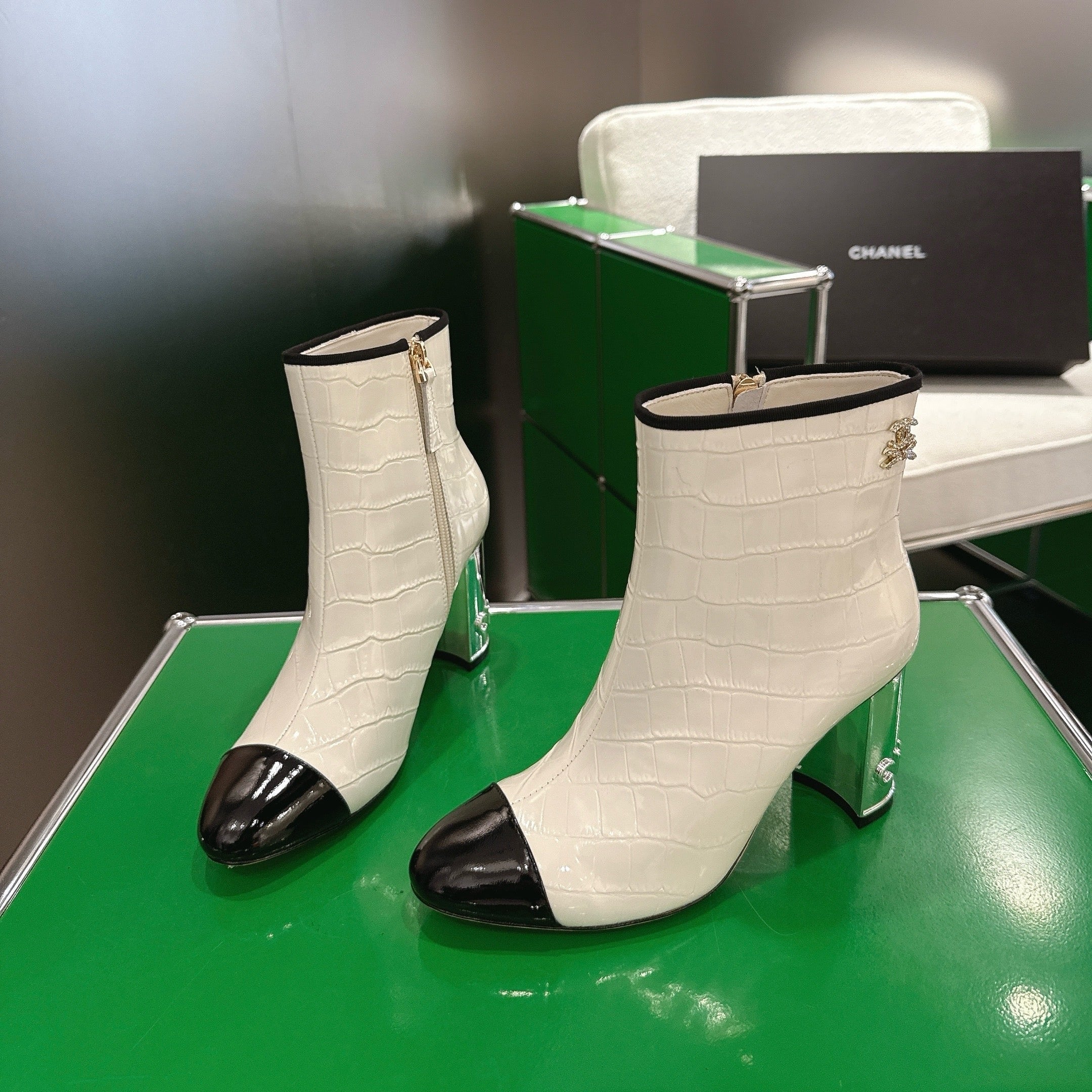 Chanel 2025𝐒𝐒 High Heeled Ankle Boots Cream and Black Glossy Leather 507546