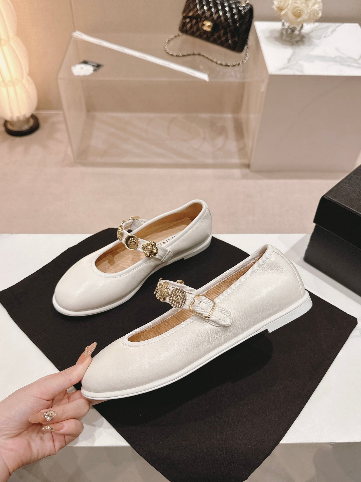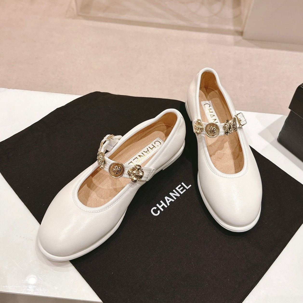 CC MARY JANES CREAM CALFSKIN LIGHT GOLD METALIC