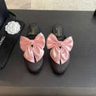 BIG BOW FLAT MULE SANDALS IN BLACK MIX PALE PINK SILK