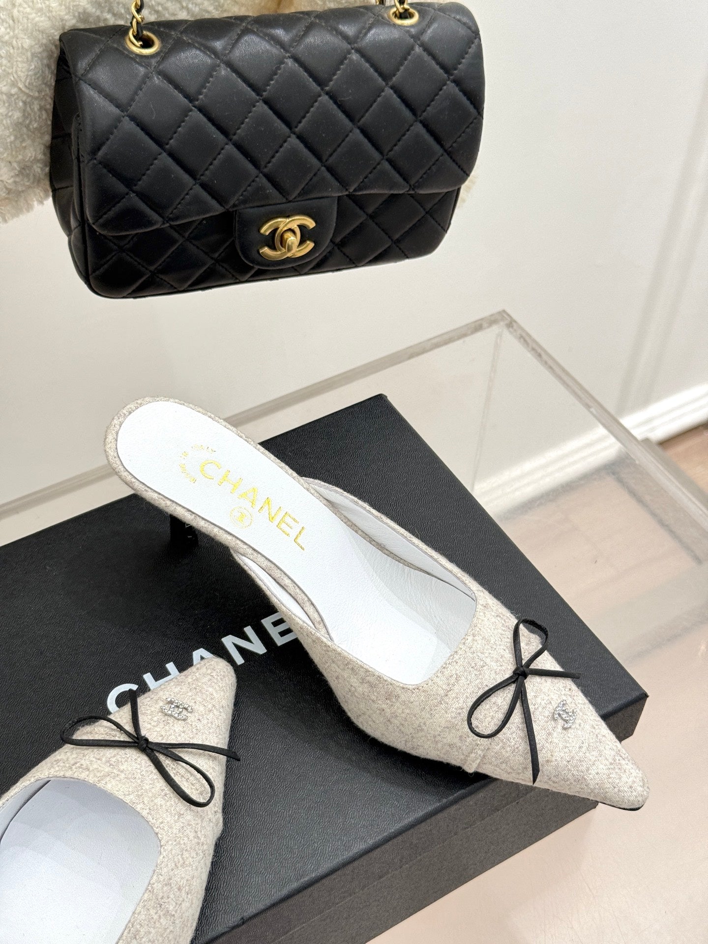 CC 25C Bowknot Pointed High Heel Half Slippers 60mm Beige Linen 265660
