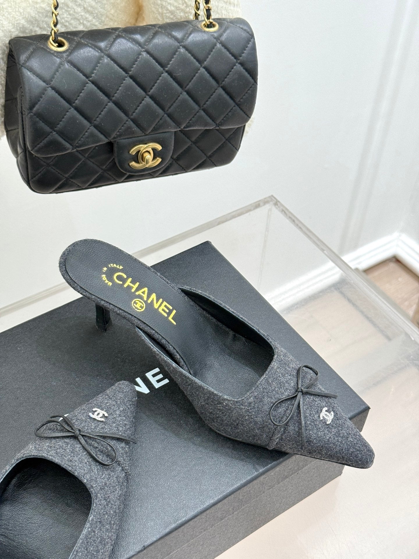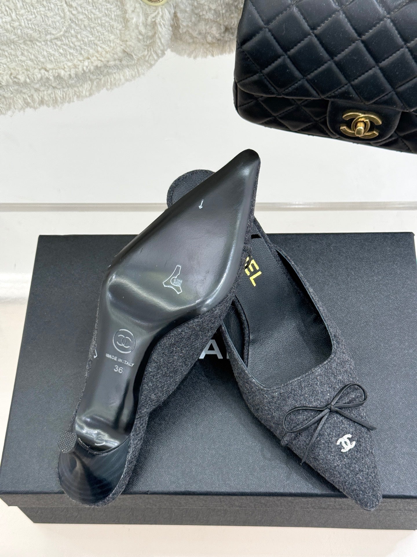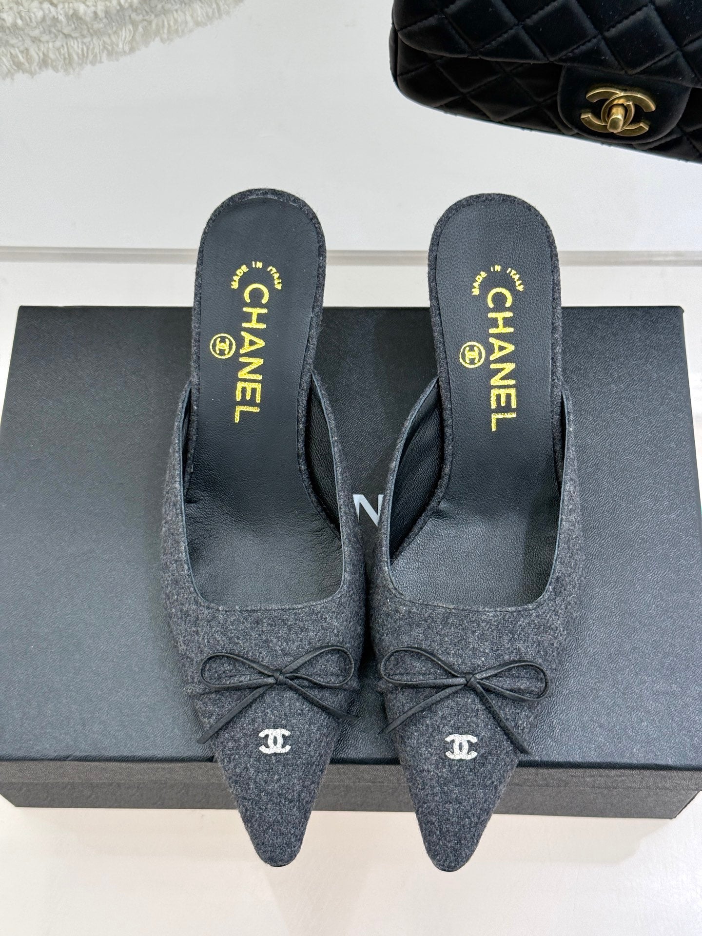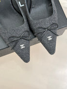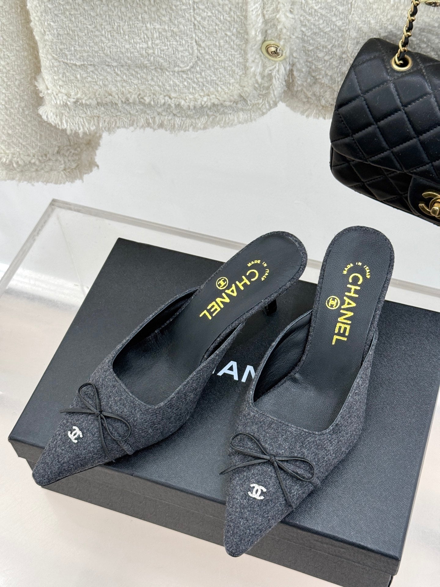 CC 25C Bowknot Pointed High Heel Half Slippers 60mm Black Linen 265662