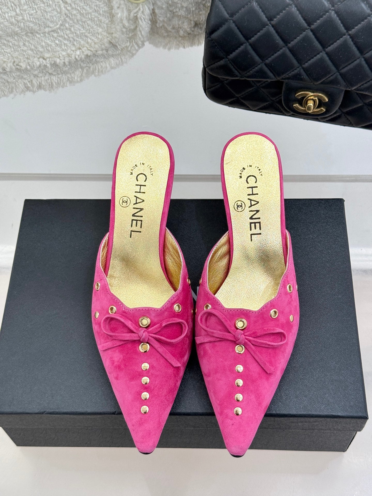 CC 25C Bowknot Pointed High Heel Half Slippers 60mm Pink Suede 265656