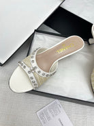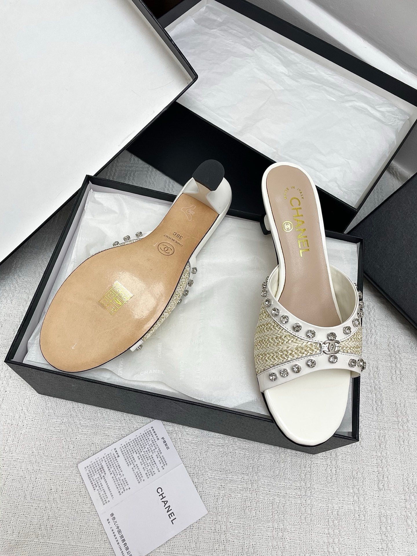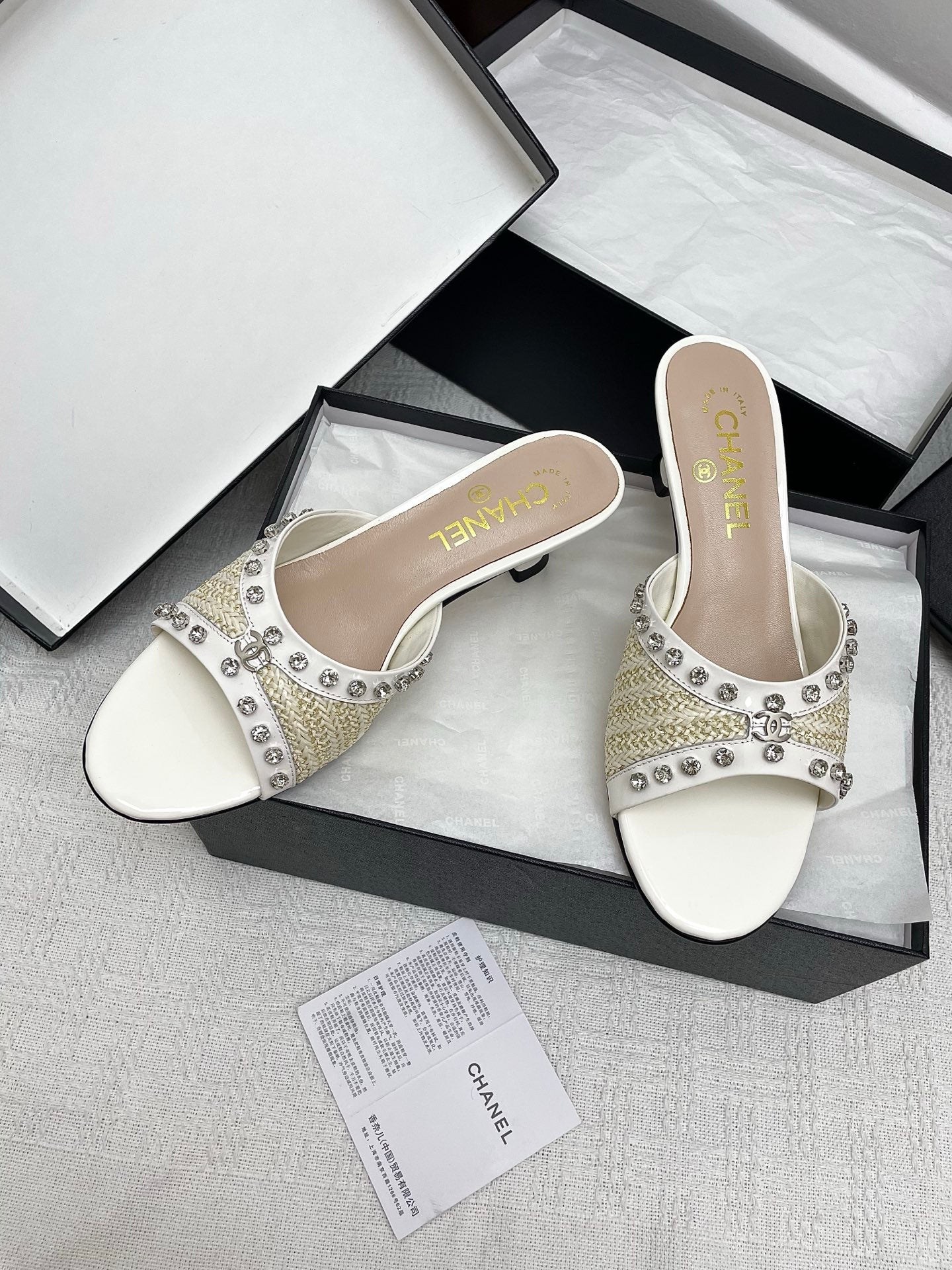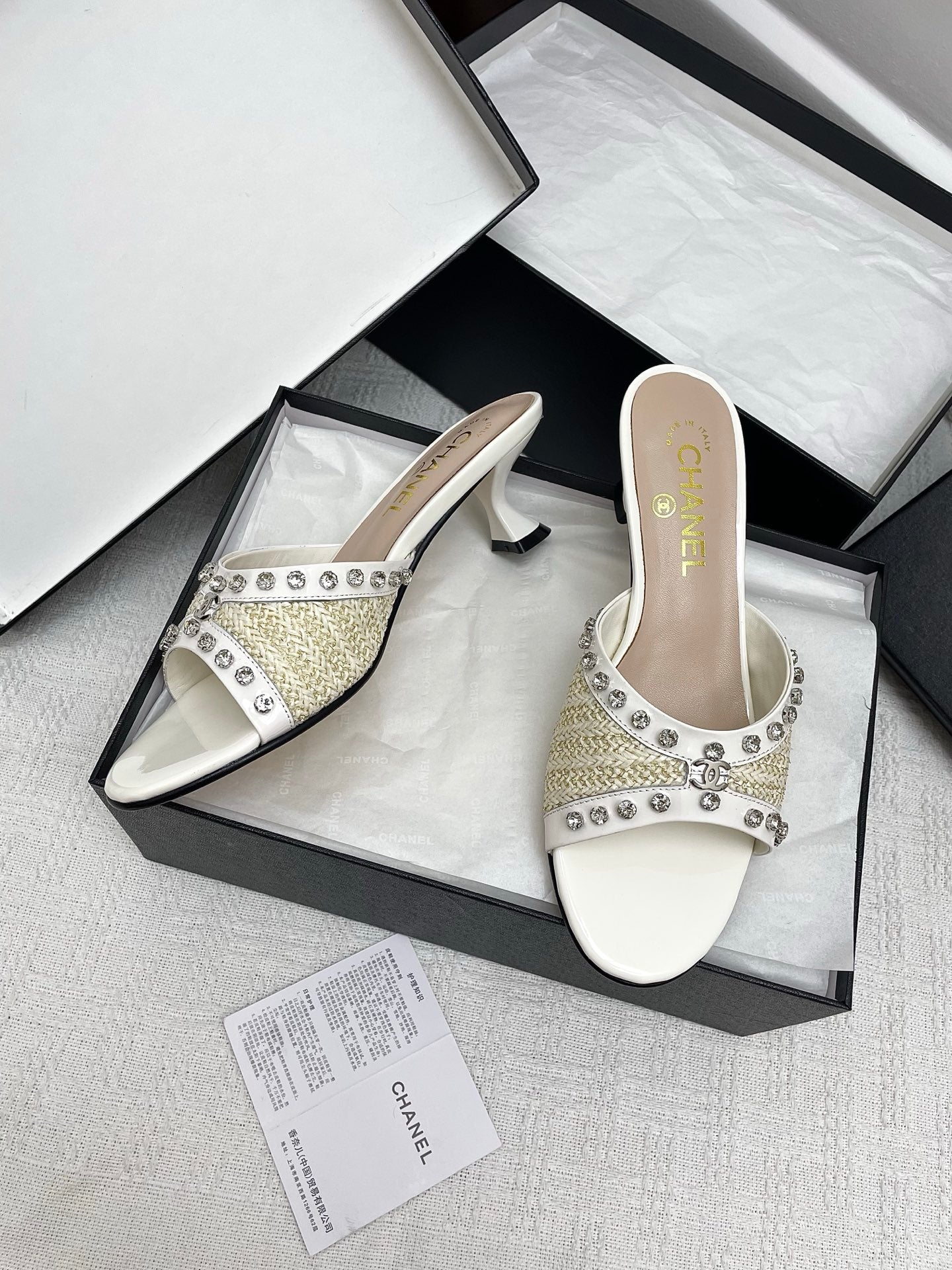 CC 25SS Slippers 5cm Light Yellow Raffia White Patent Calfskin 338301