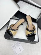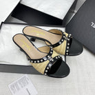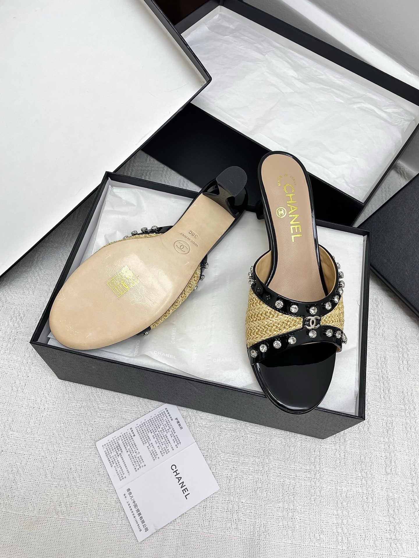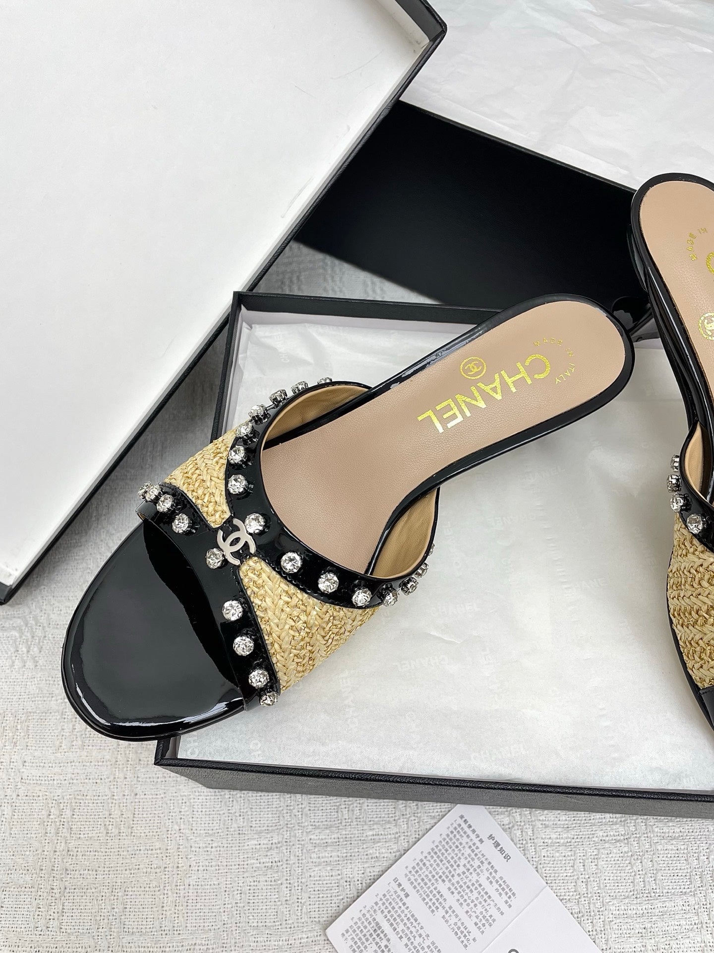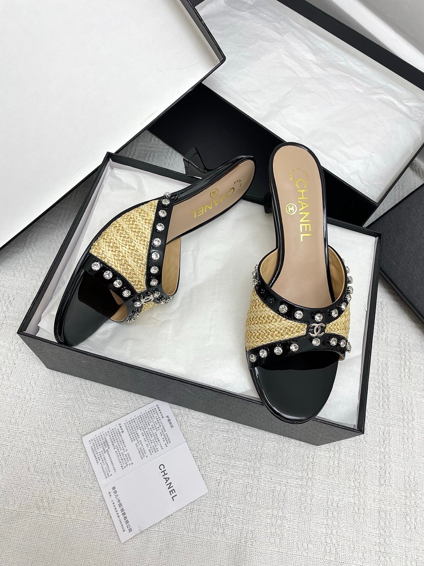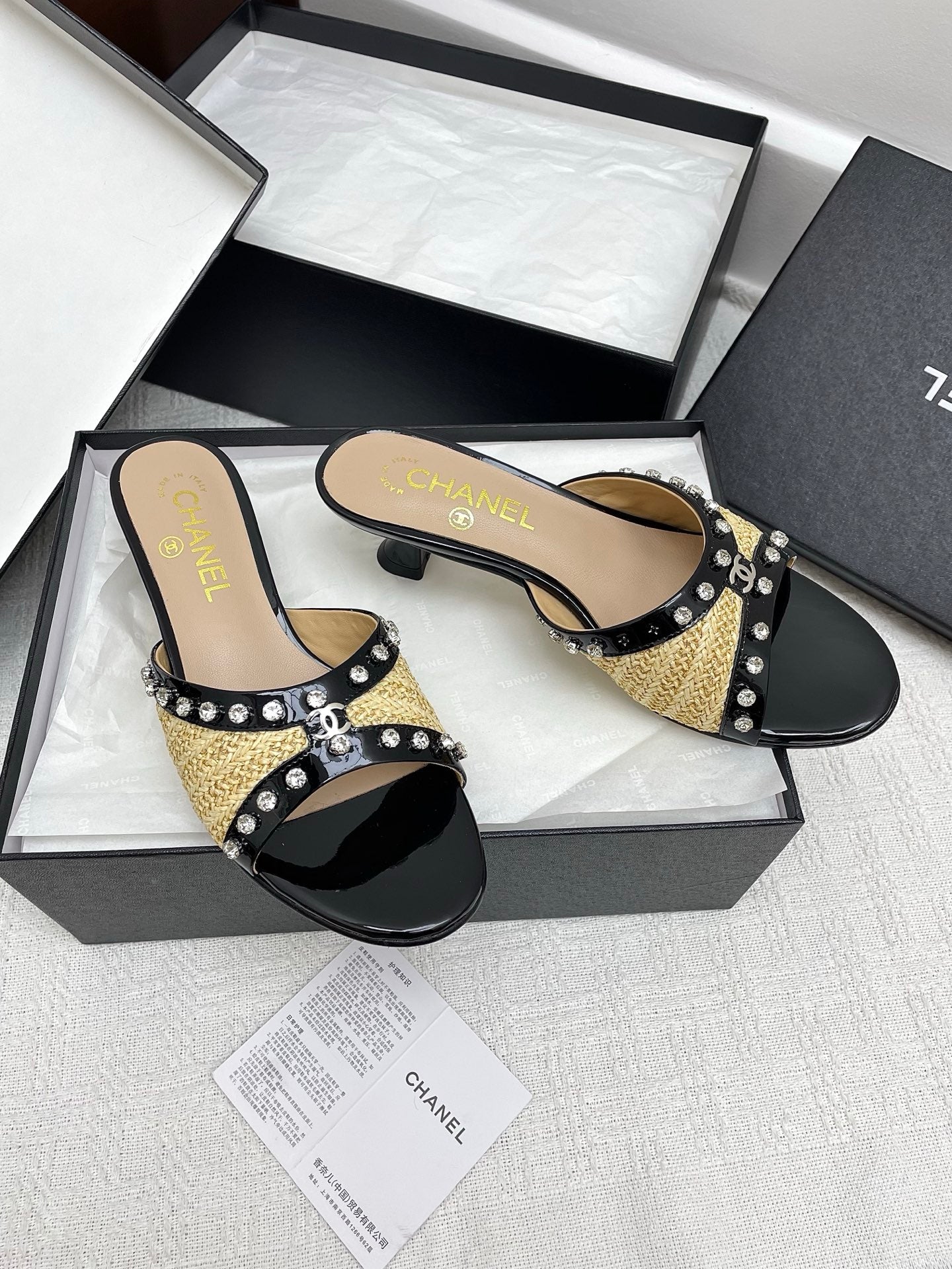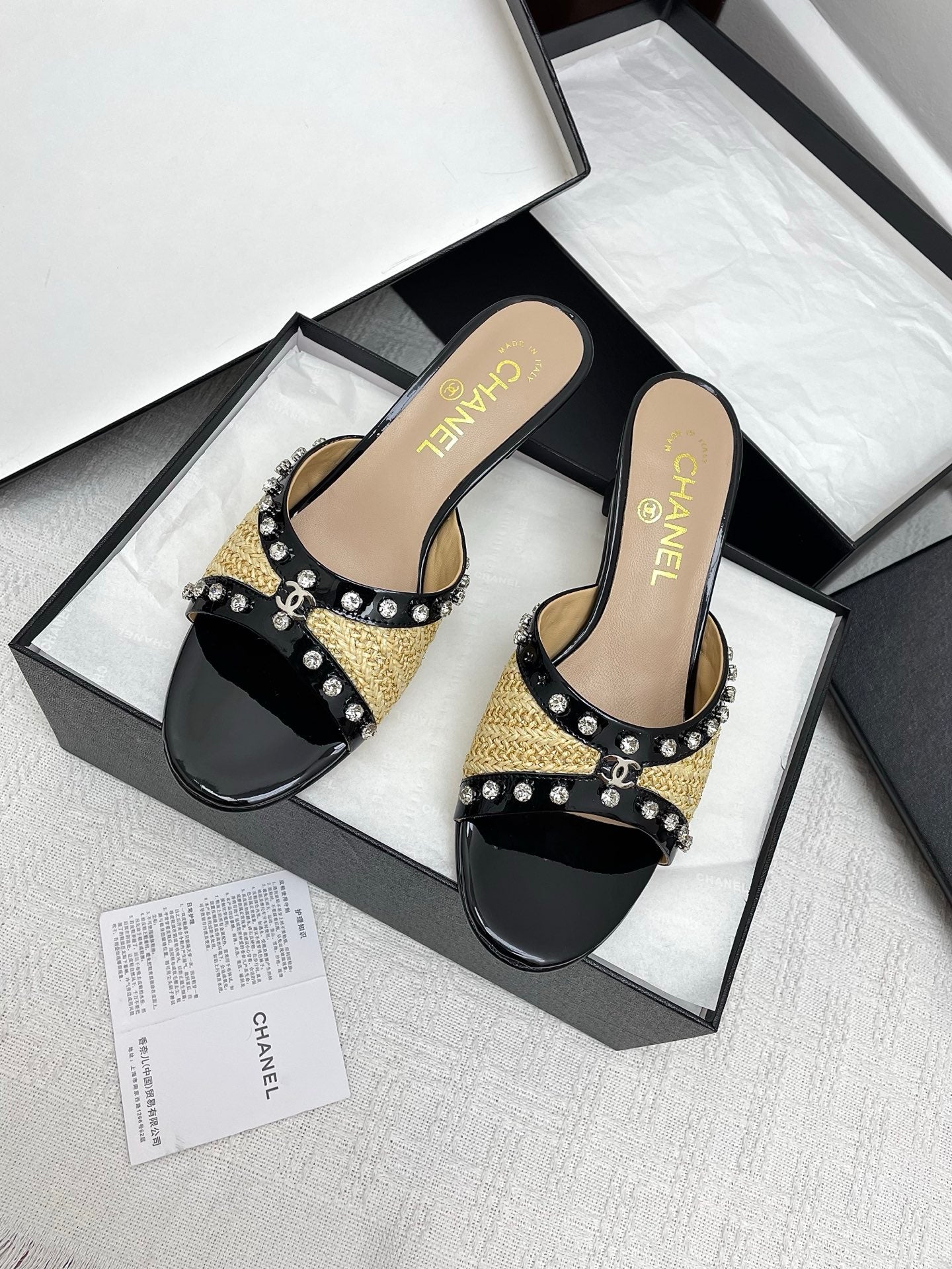 CC 25SS Slippers 5cm Yellow Raffia Black Patent Calfskin 338300
