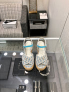 PEEP-TOE THICK SOLE SANDALS IN WHITE MIX BLUE WOVEN FABRIC