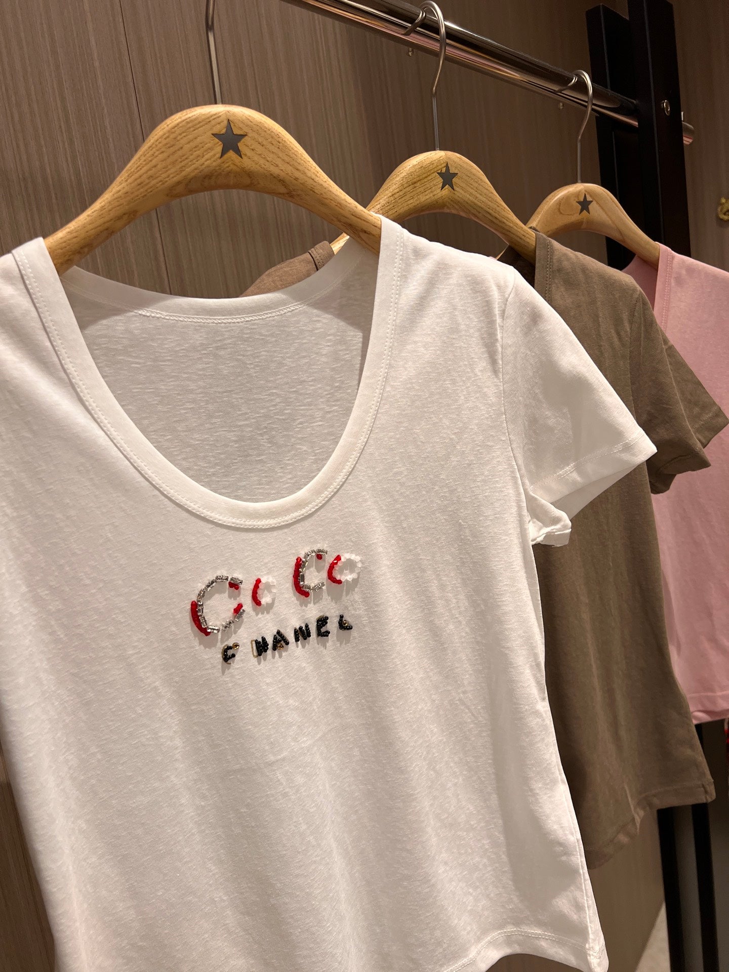 CC Hand-beaded Coco letter U-neck T-shirt Cotton