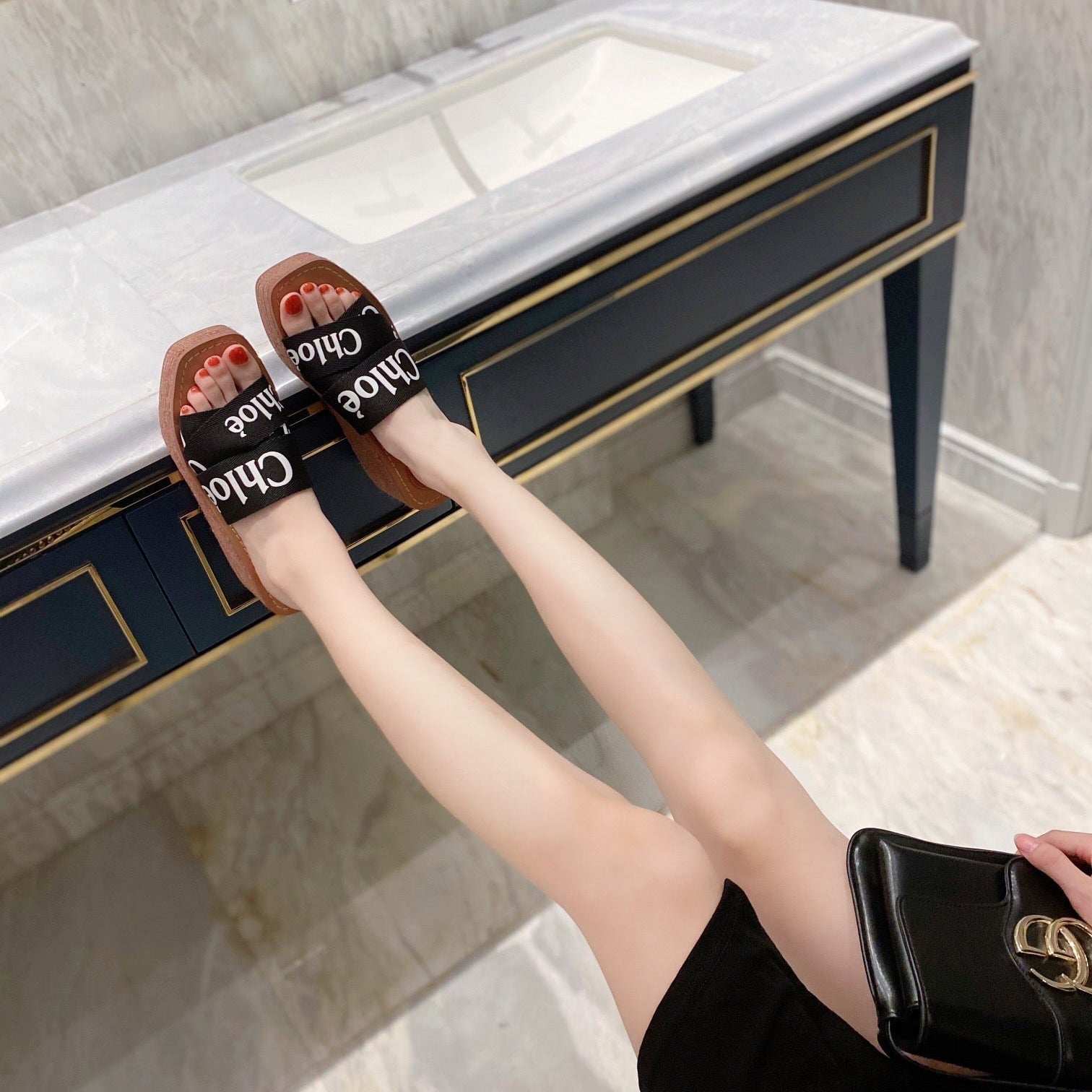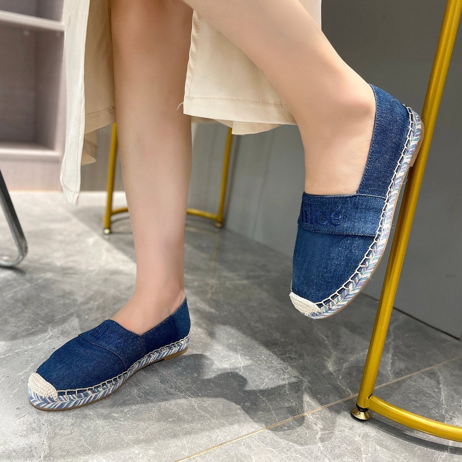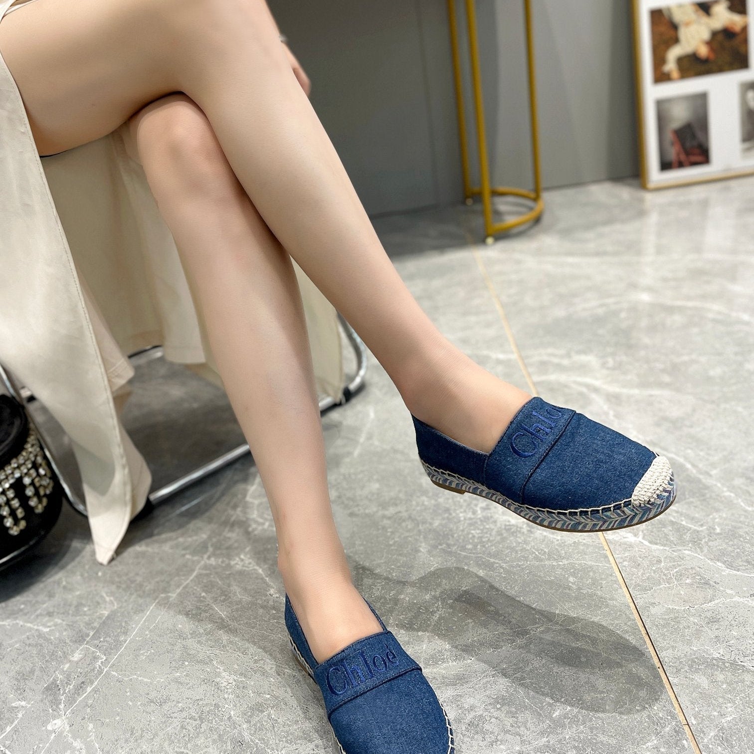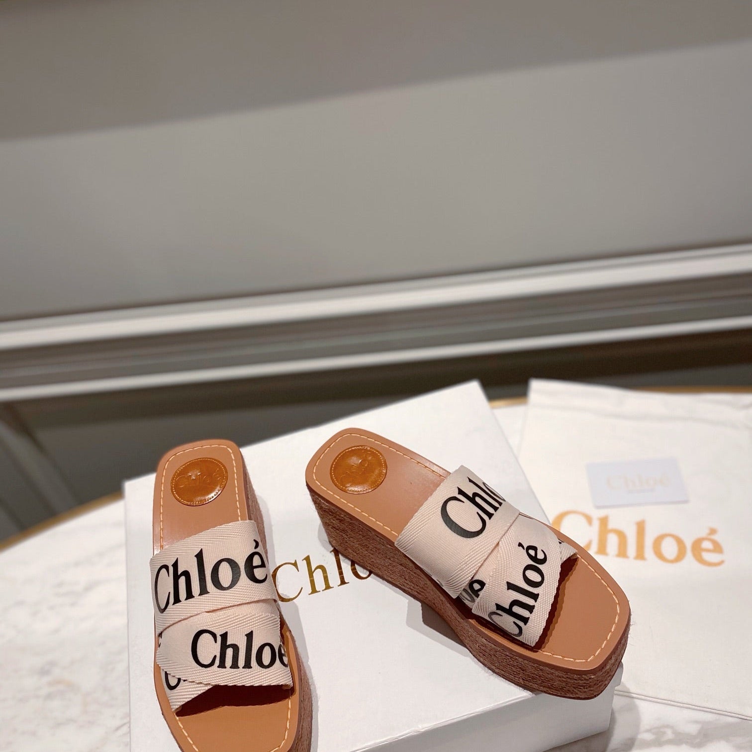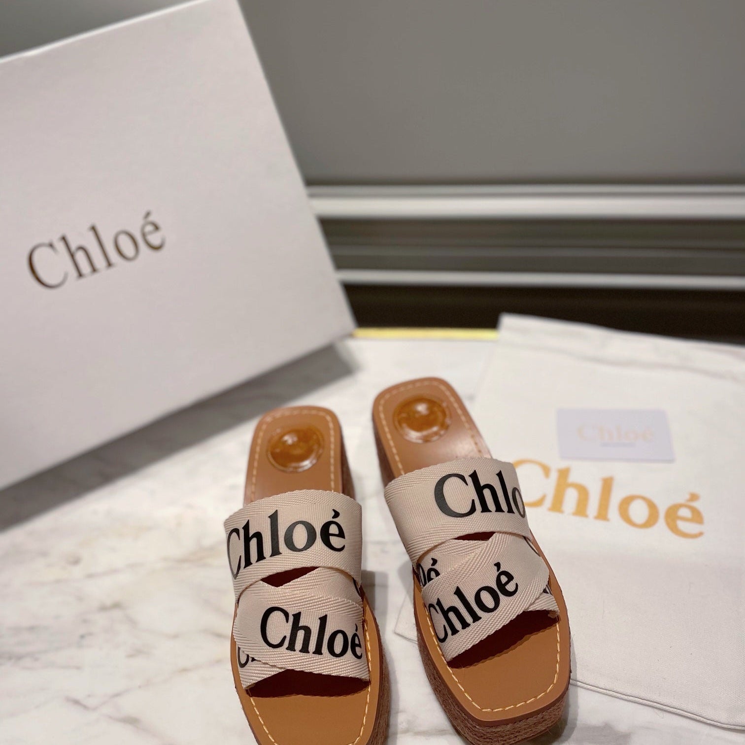 CHLOÉ SLIDE MULE IN LIGHT BLUE DENIM AND BROWN CALFSKIN GOLD HARDWARE