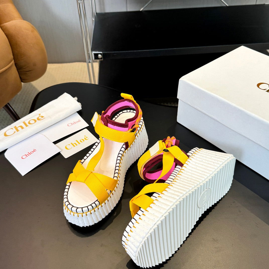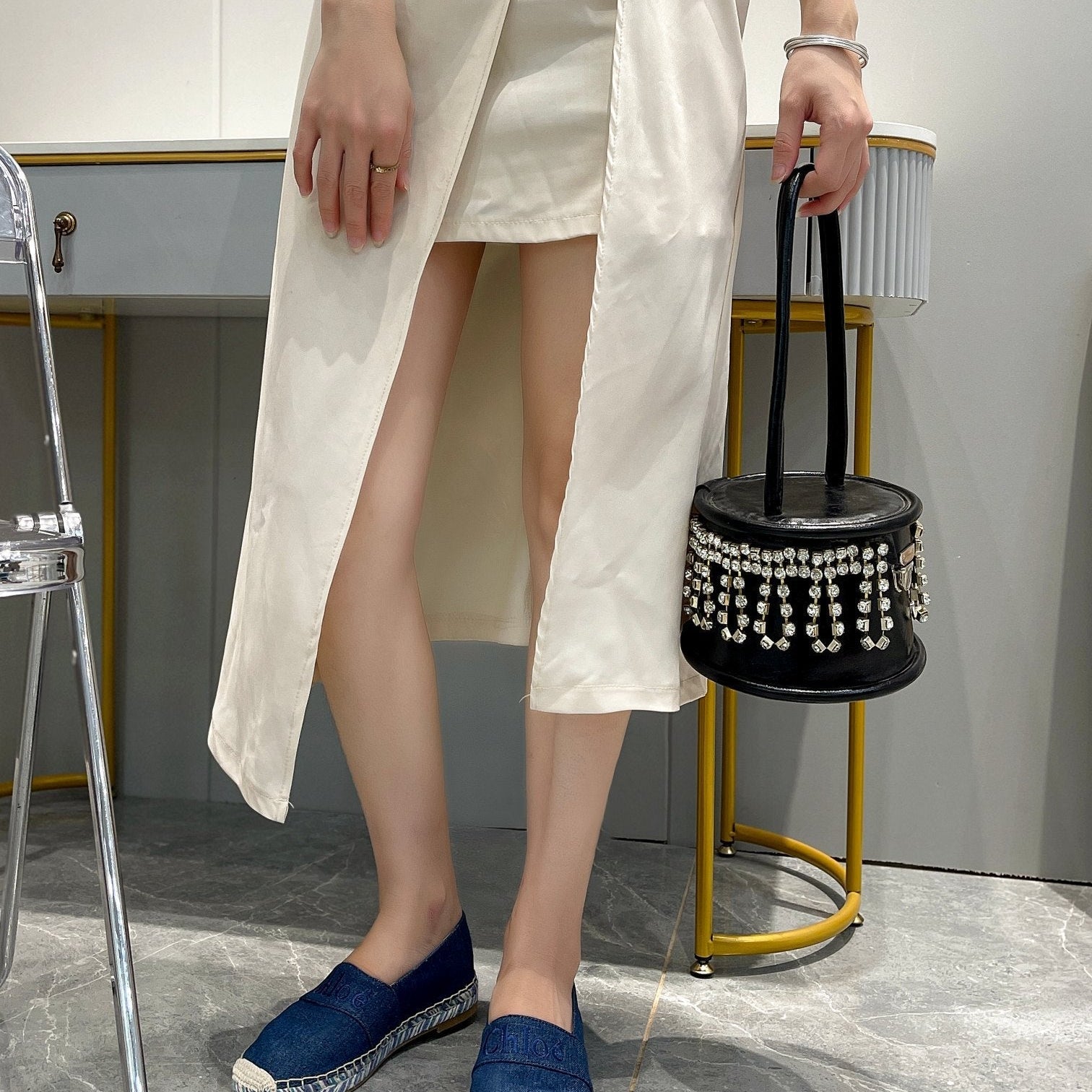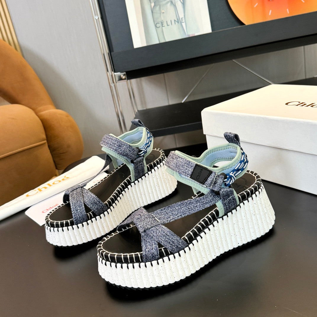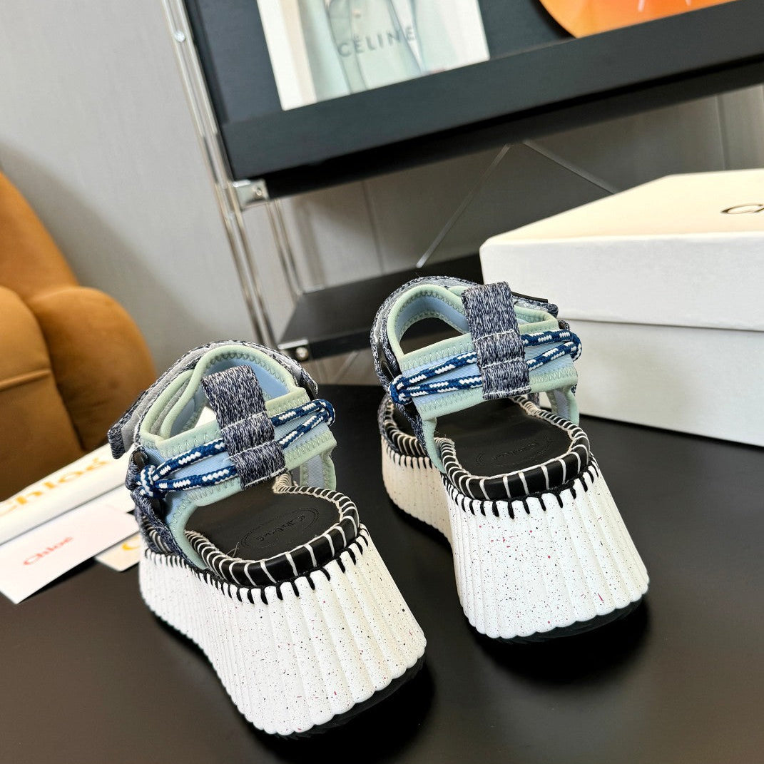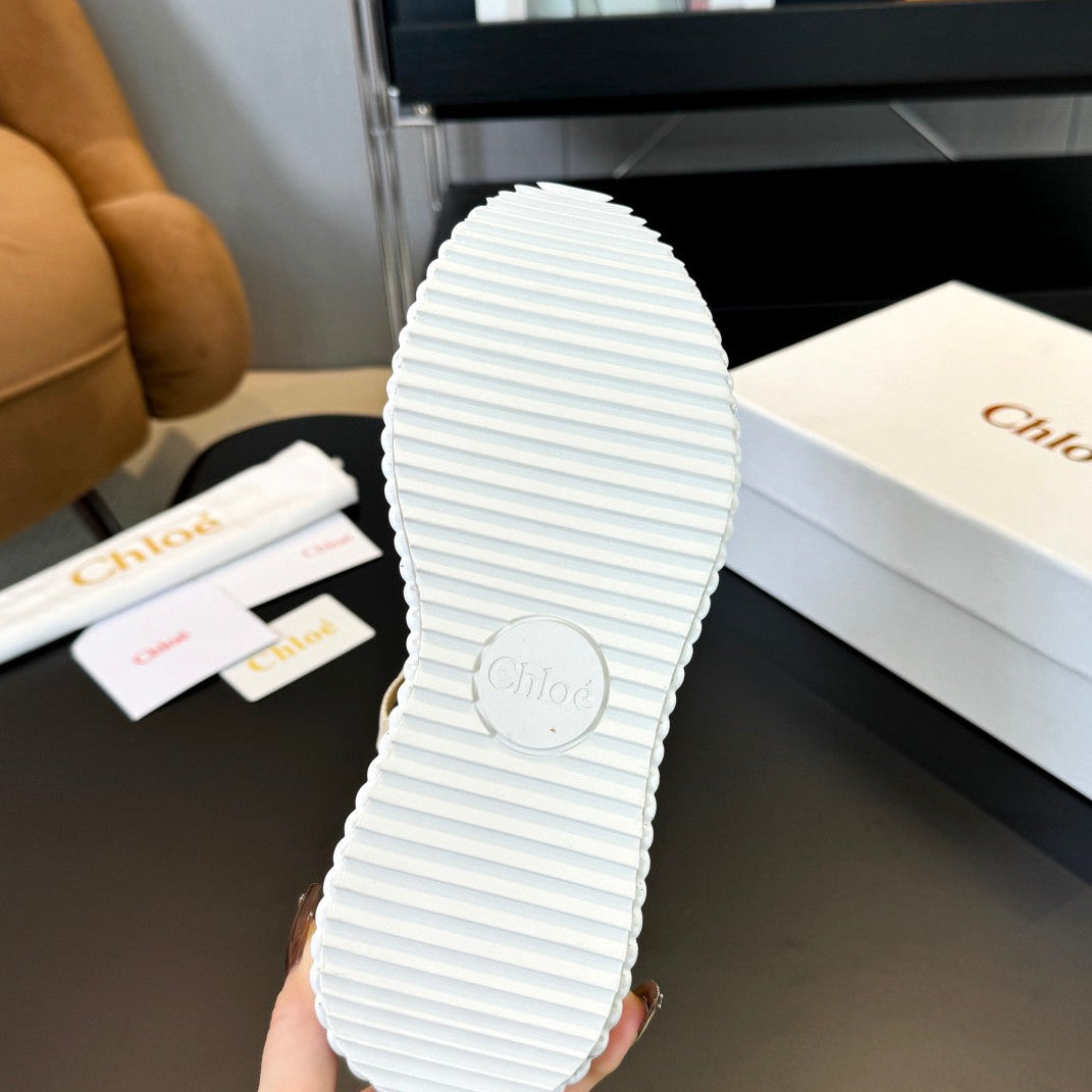 CHLOÉ SLIDE MULE IN LIGHT BLUE DENIM AND BROWN CALFSKIN GOLD HARDWARE