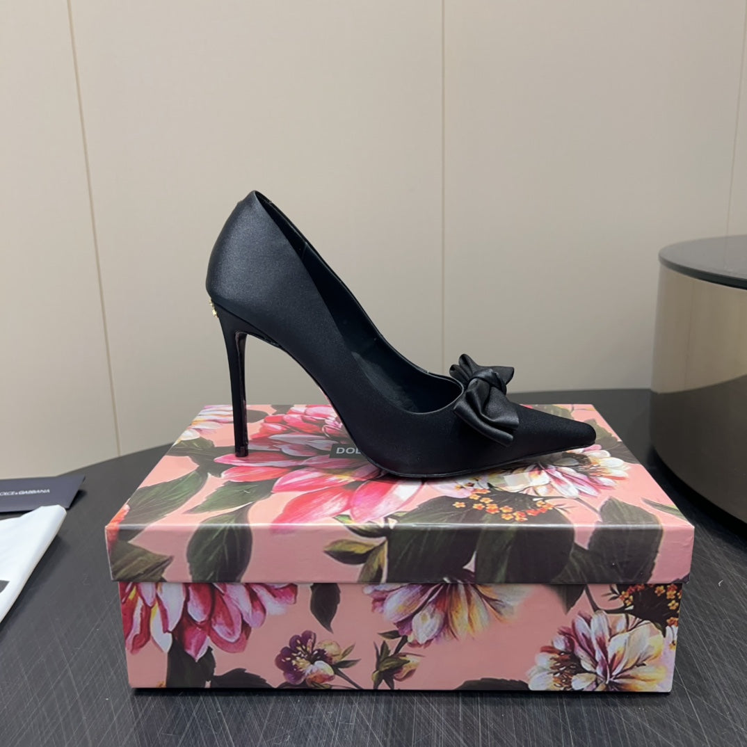 DC 25 Toe Bow High Heel Shoes 100mm Black Silk And Sheepskin 381609