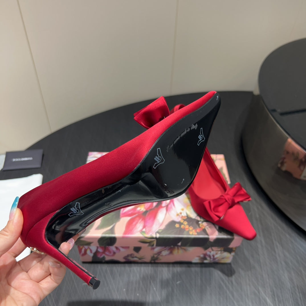 DC 25 Toe Bow High Heel Shoes 100mm Red Silk And Sheepskin 381610