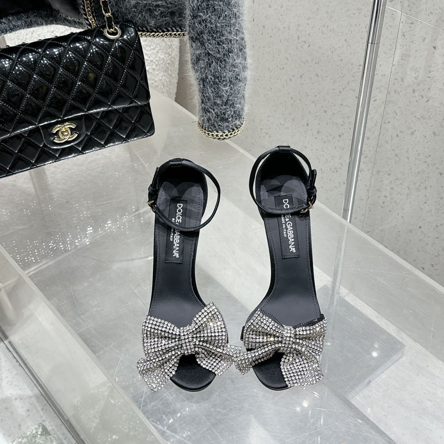 DC Rhinestone Bow Heel Sandals 105mm Black Satin & Sheepskin 359509