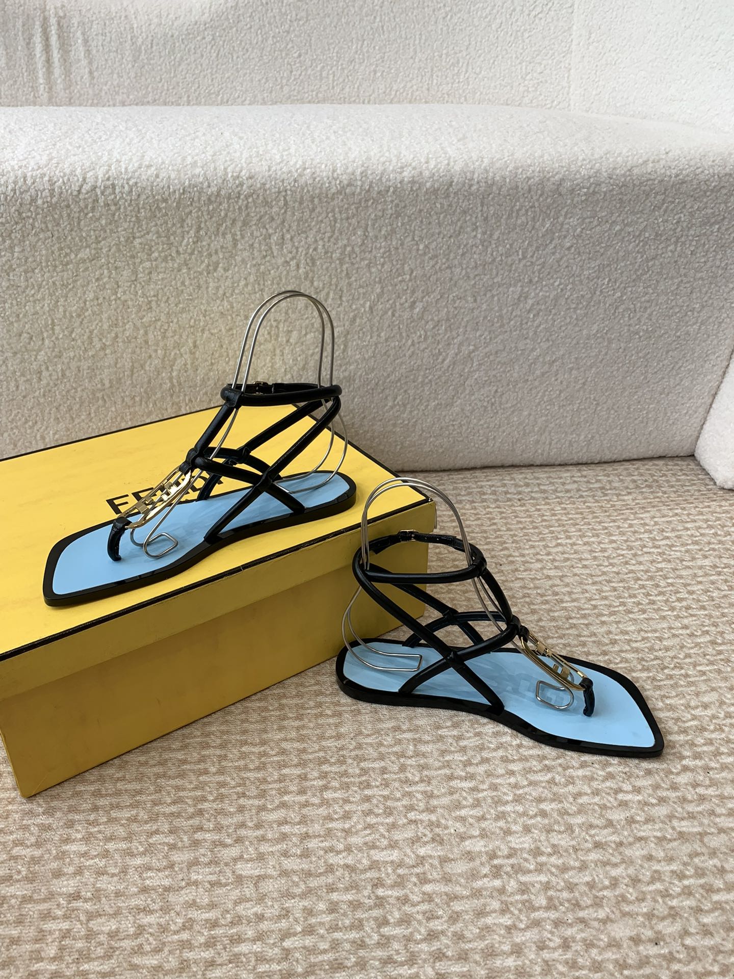 FENDI O'LOCK THONG SANDAL BLACK AND BLUE CALFSKIN WITH GOLD HARDWARE