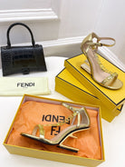 FENDI HIGH-HEELED 85 MM SANDALS IN GOLDEN LAMBSKIN WITH GOLD HARDWARE