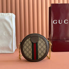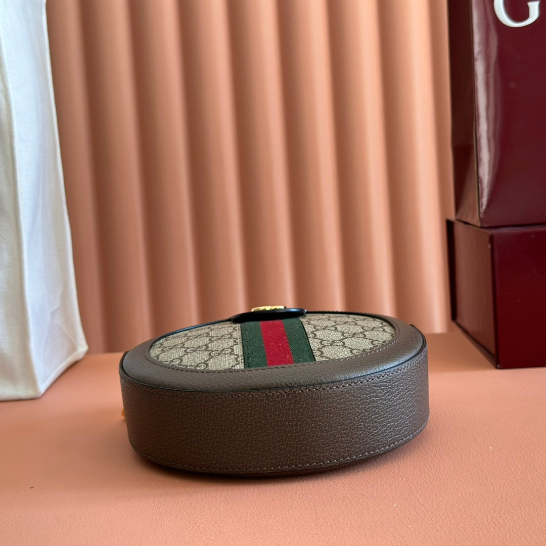 Gucci Ophida GG Round Bag Taupe Beige Canvas Grain Leather
