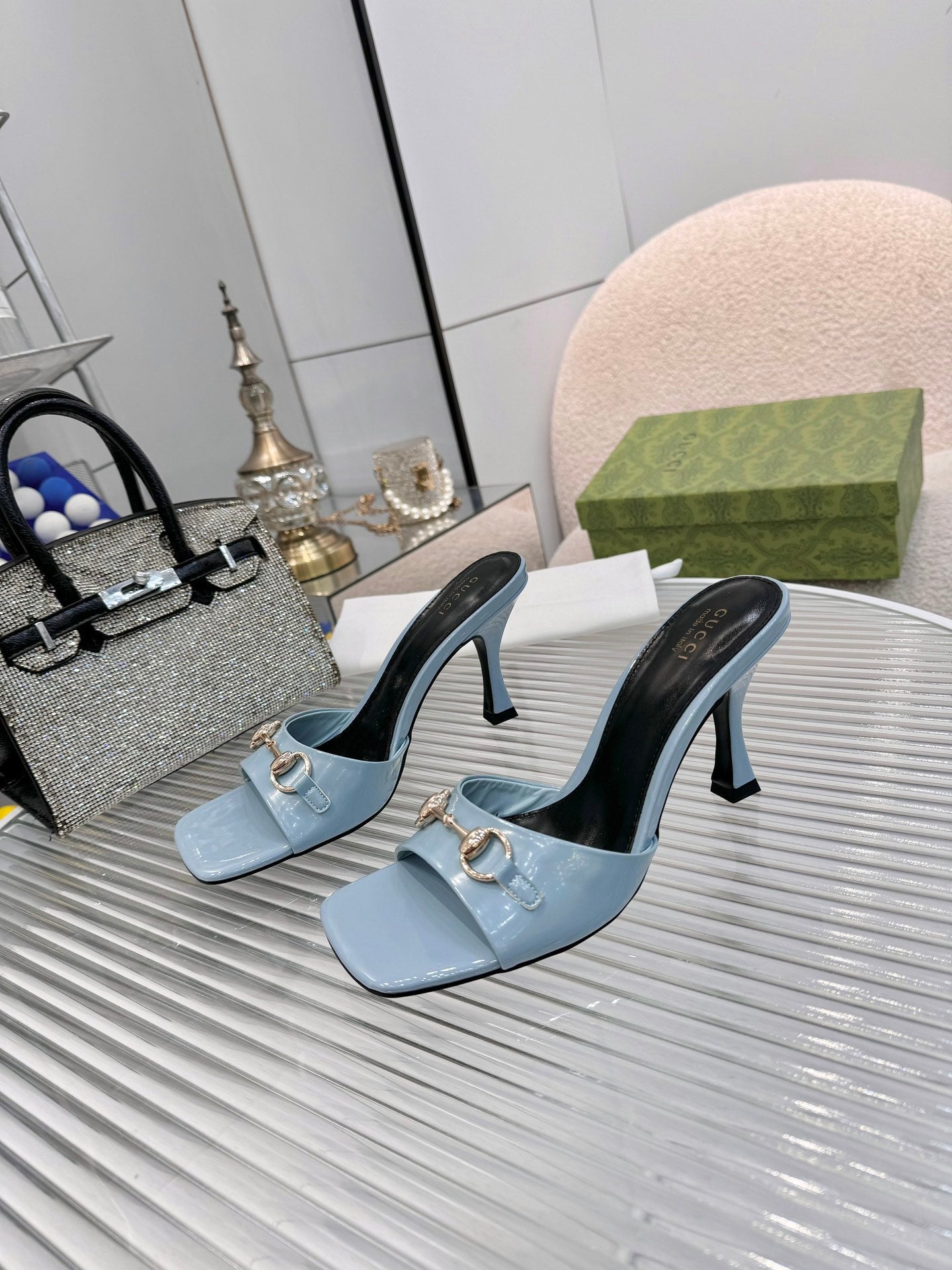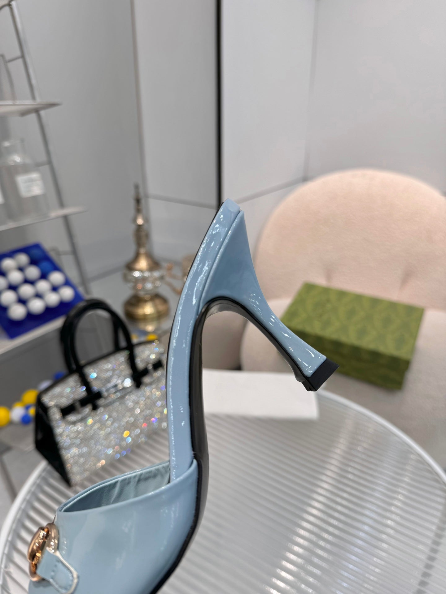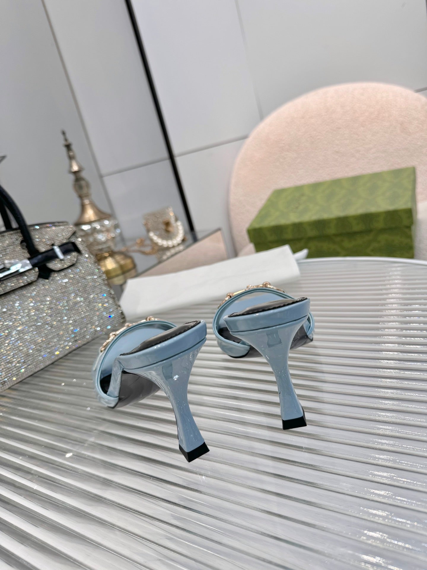 GG Gold Buckle Slide Sandal 80mm Blue-gray Patent Leather 457564