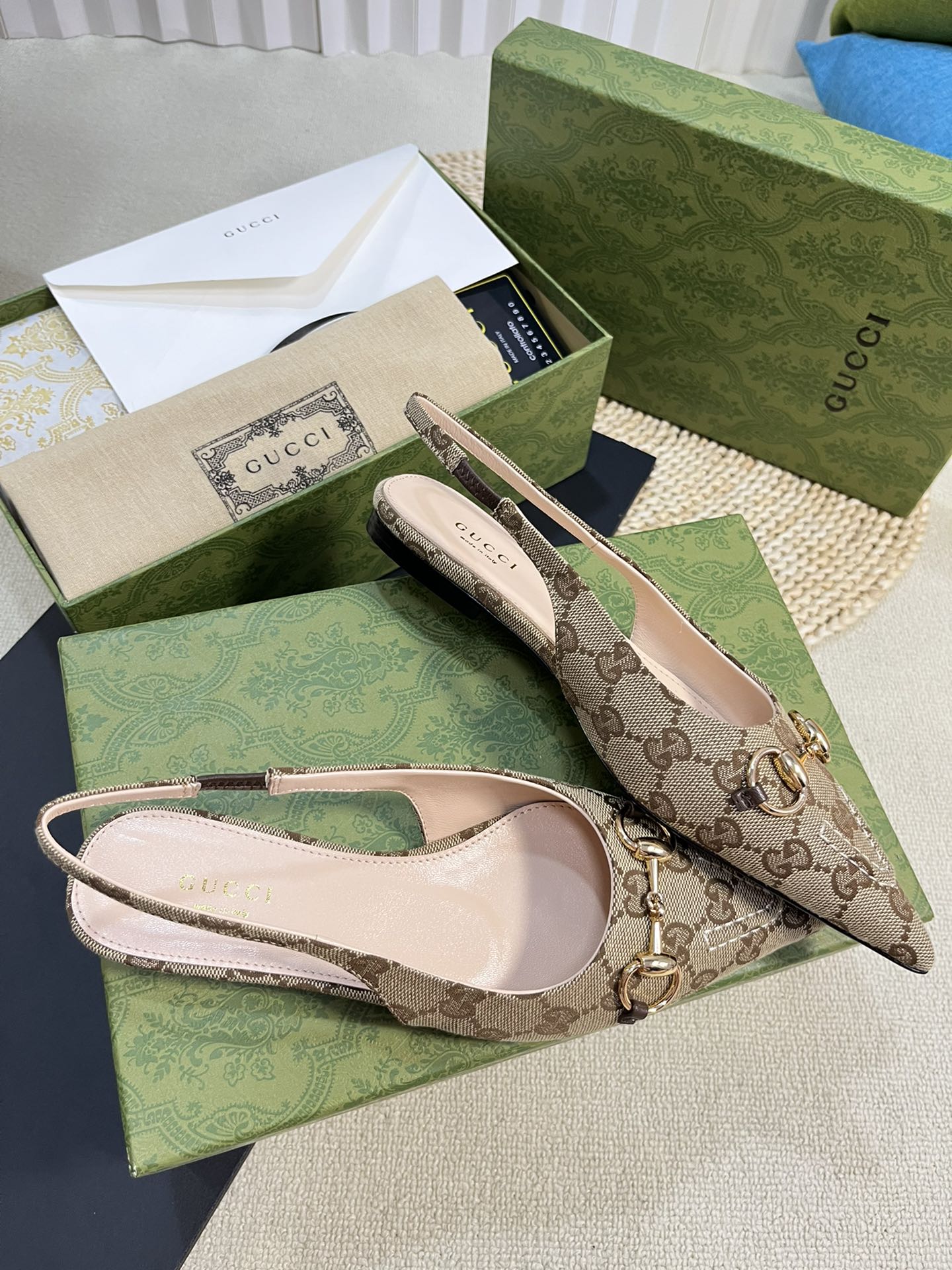 GC Horsebit Slingback Pump 10mm Beige mix Brown Canvas Sheepskin 294554