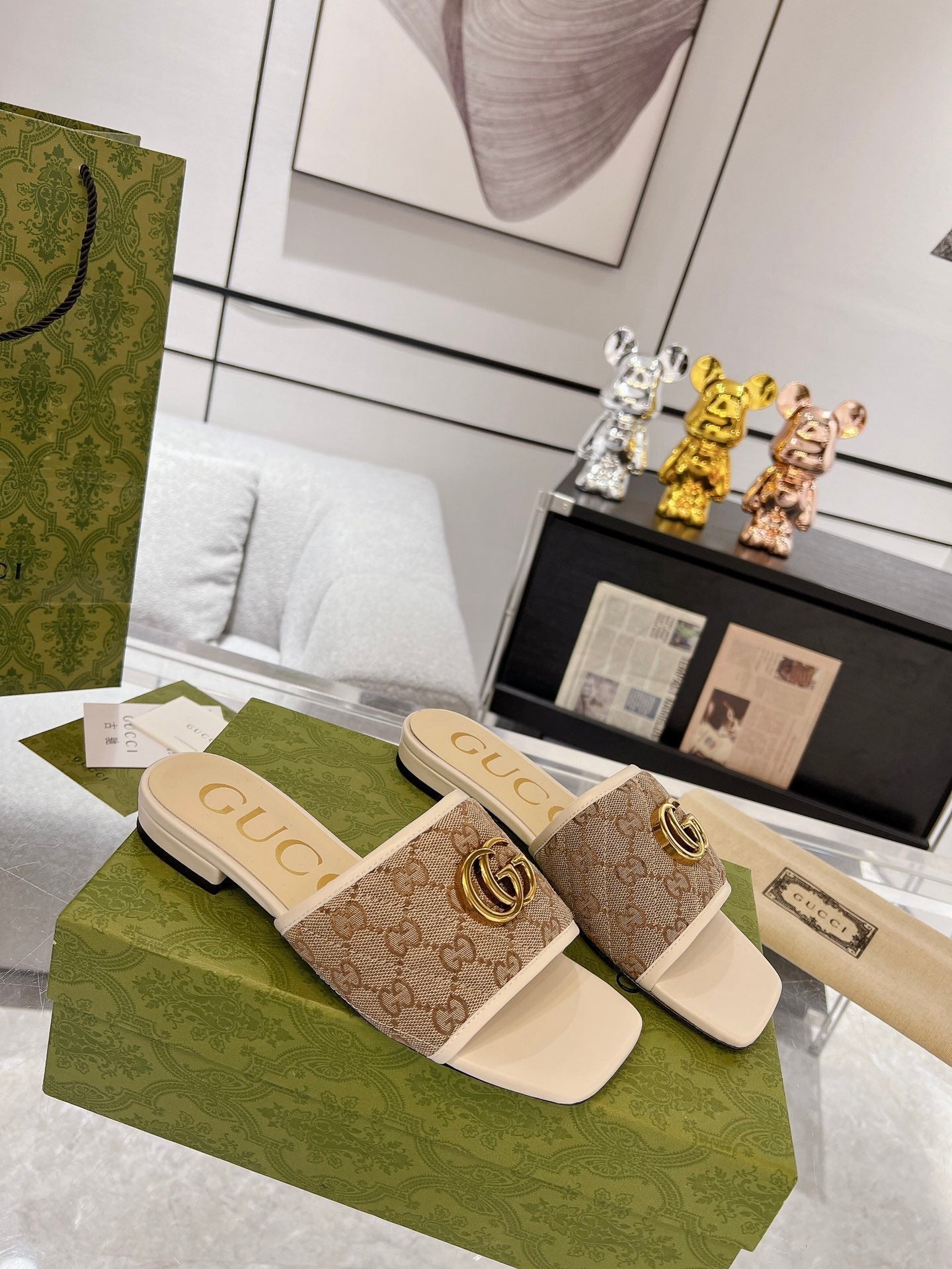 GG EXCLUSIVE SLIDE SANDAL IVORY AND BROWN FABRIC