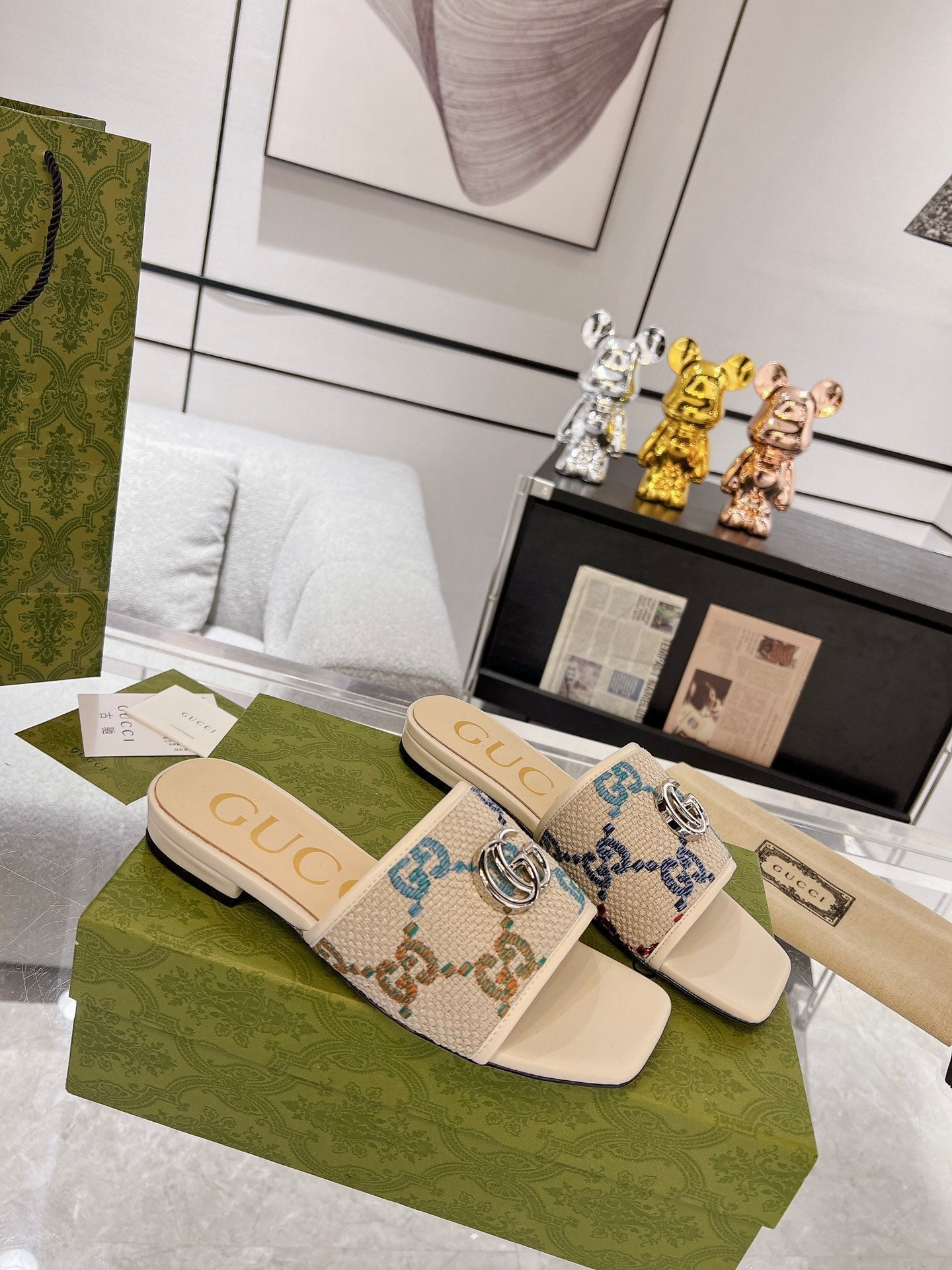 GG EXCLUSIVE SLIDE SANDAL IVORY SEDGE WITH NAVY PATTERN