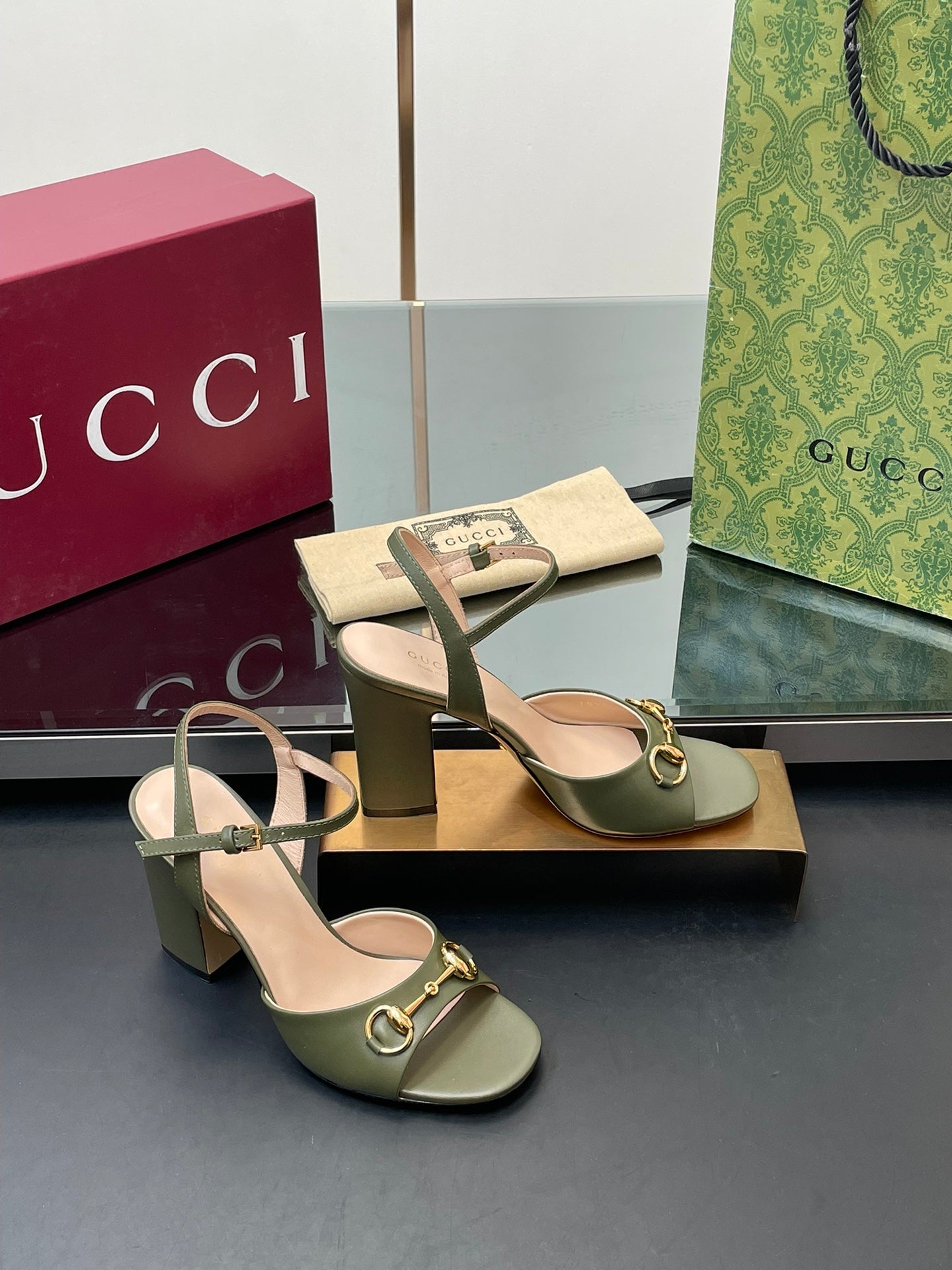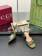 GG Women Horsebit High Heel Sandal Open Toe Olive Sheepskin 149217