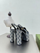 GG WOMEN'S HORSEBIT PLATFORM LOAFER SLINGBACK IN BEIGE AND BLUE CANVAS