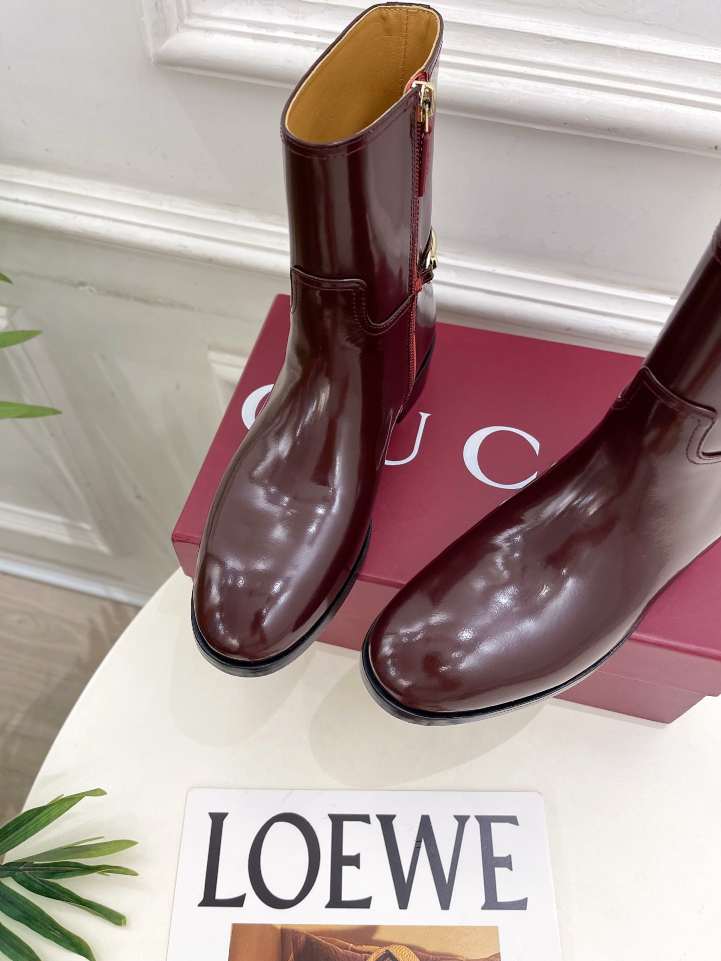 Gucci 25𝐬𝐬 horsebit ankle boots burgundy patent calfskin 435385