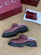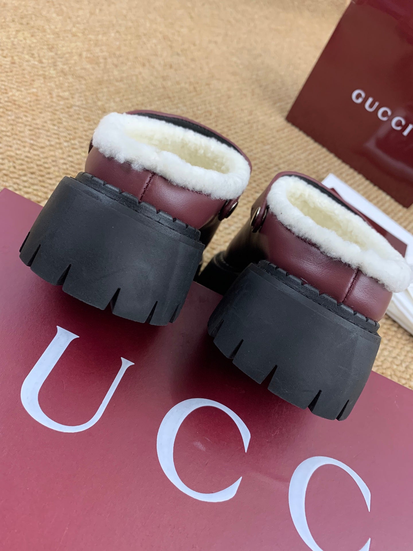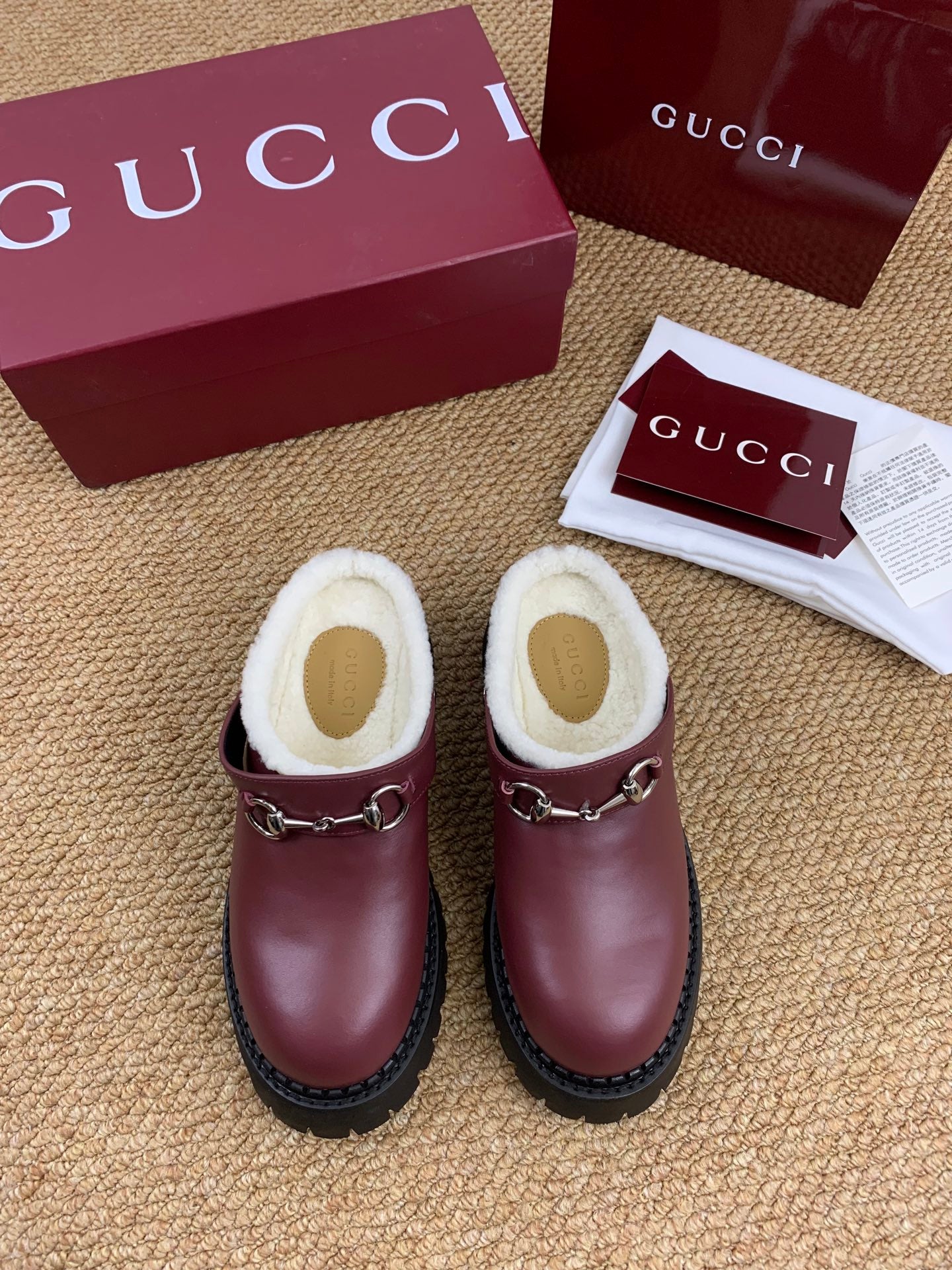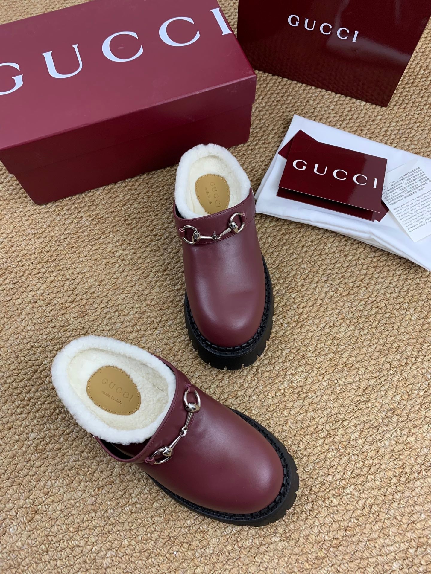 Gucci FW 25 Horsebit Suede Clog Deep Burgundy Leather with Shearling 506442