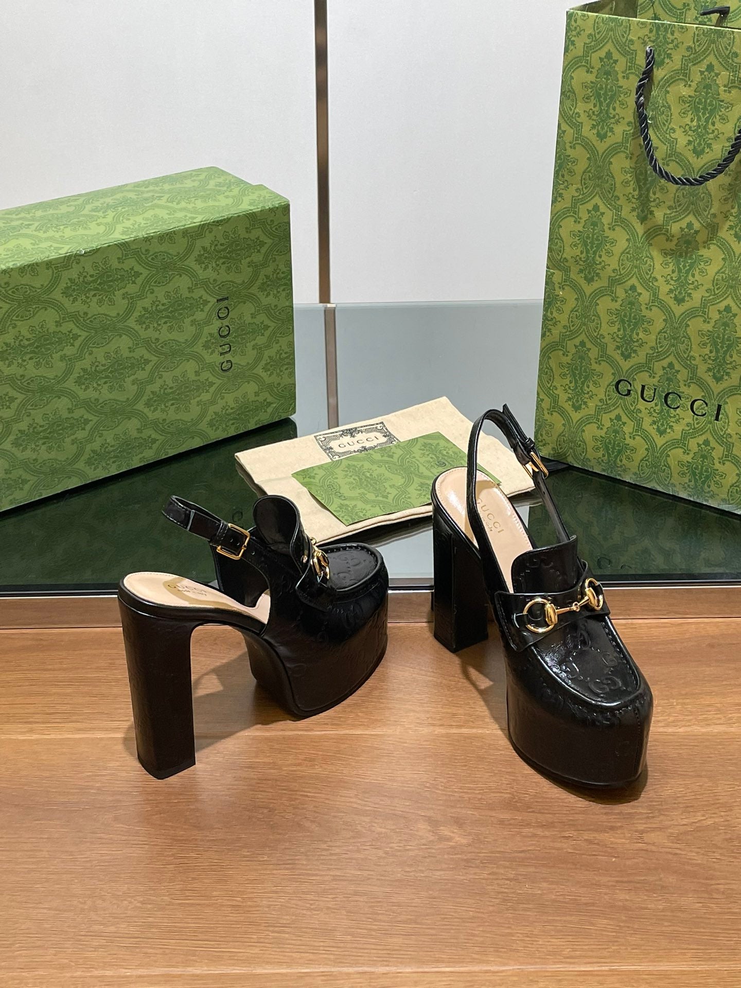 GG WOMEN'S HORSEBIT PLATFORM SLINGBACK IN BLACK EMBOSSED CALFSKIN