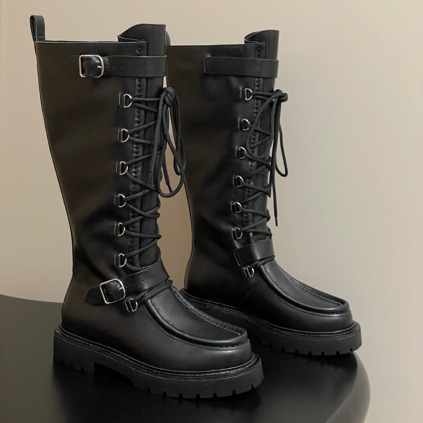 HM Lace Up Boots 25mm Belt Buckle Black Leather
