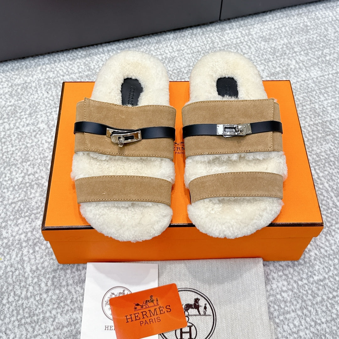 HM Kelly slippers Khaki Cowhide Suede Fur 462204