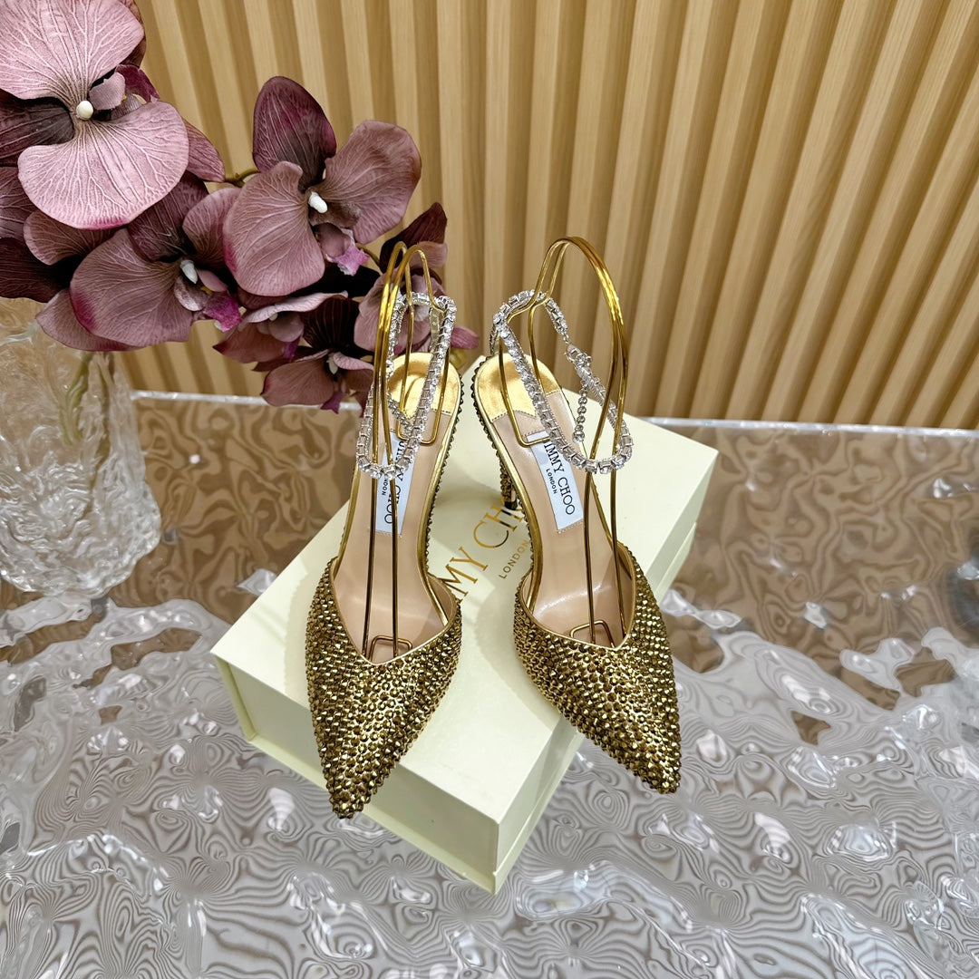 Jimmy Saeda 100mm In Gold Satin Pumps With Crystal Embellishment 641064