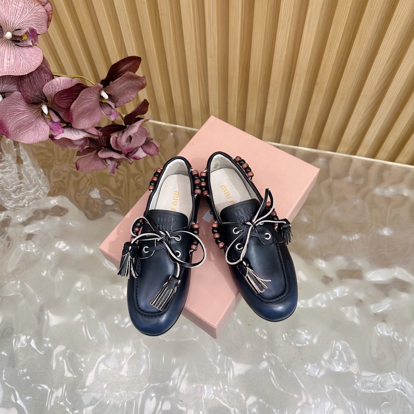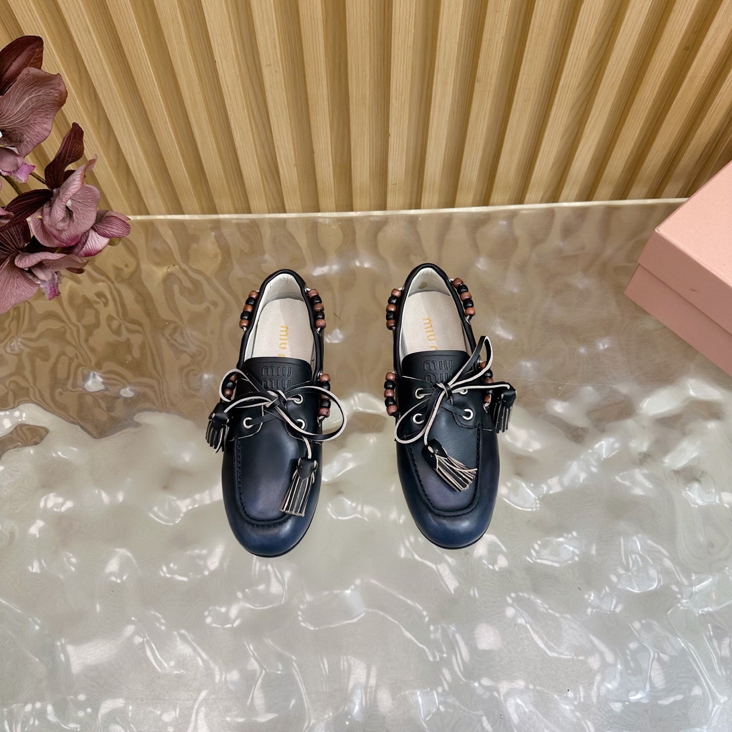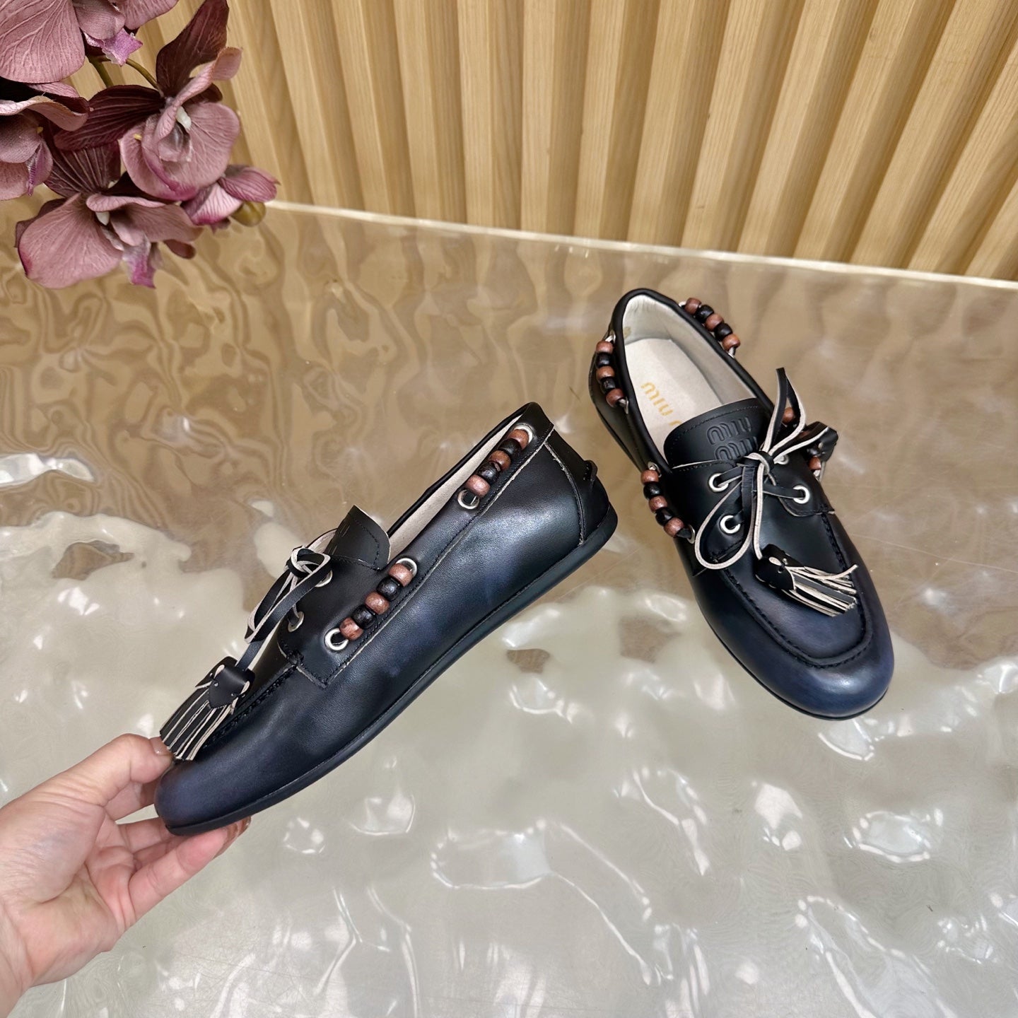 Miu Laces Eyelet Flat Loafer Black Sheepskin 498170