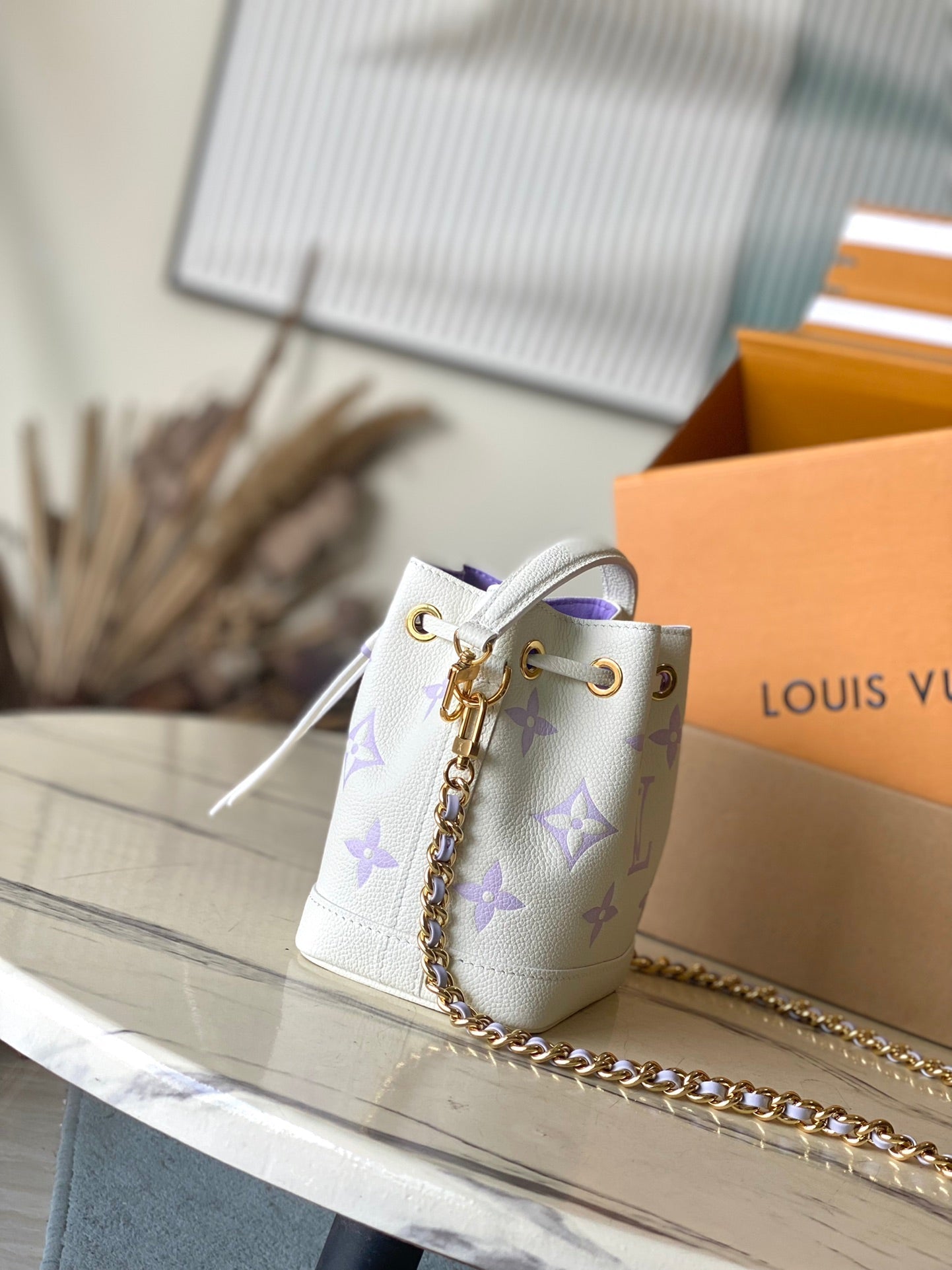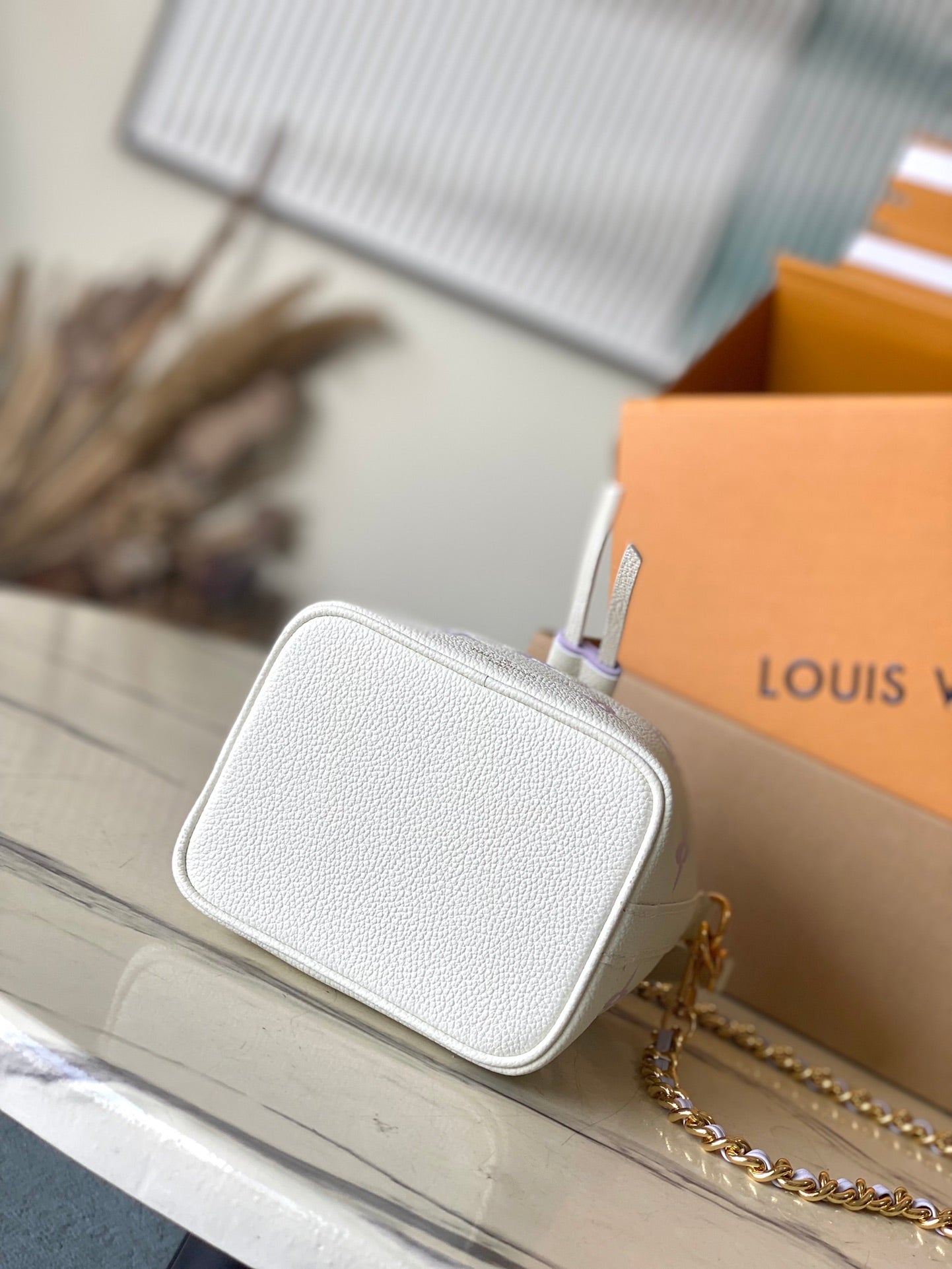 NANO NOÉ 16 IN WHITE PURPLE MONOGRAM EMBOSSED CALFSKIN