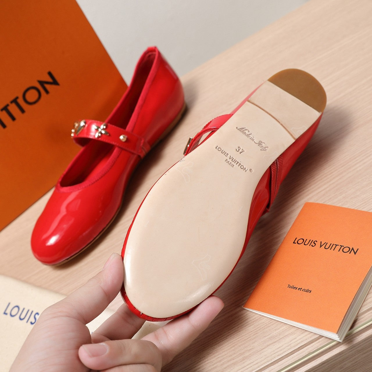 LV 25C Romy Flat Red Patent calf leather With gold logo 218306