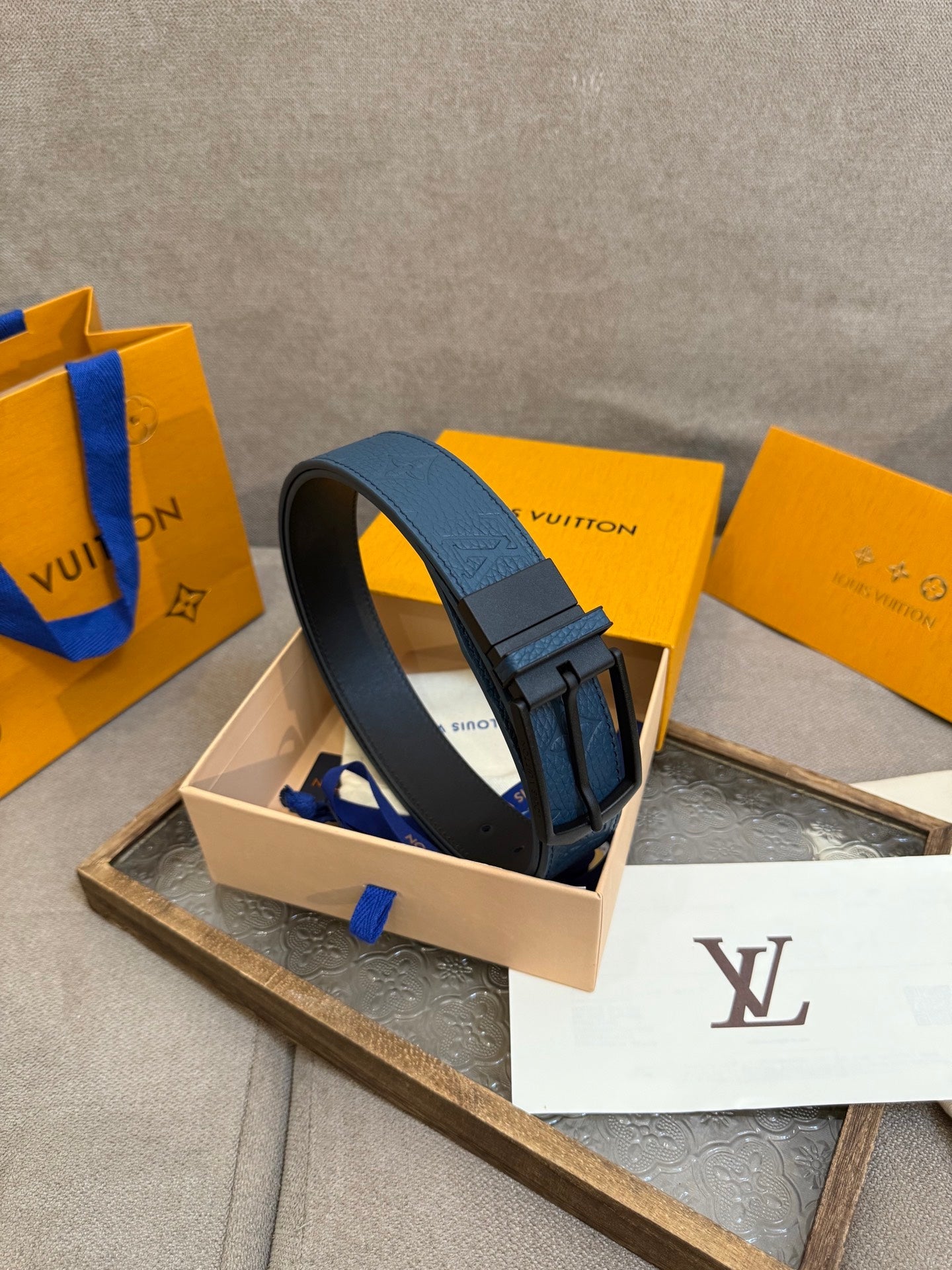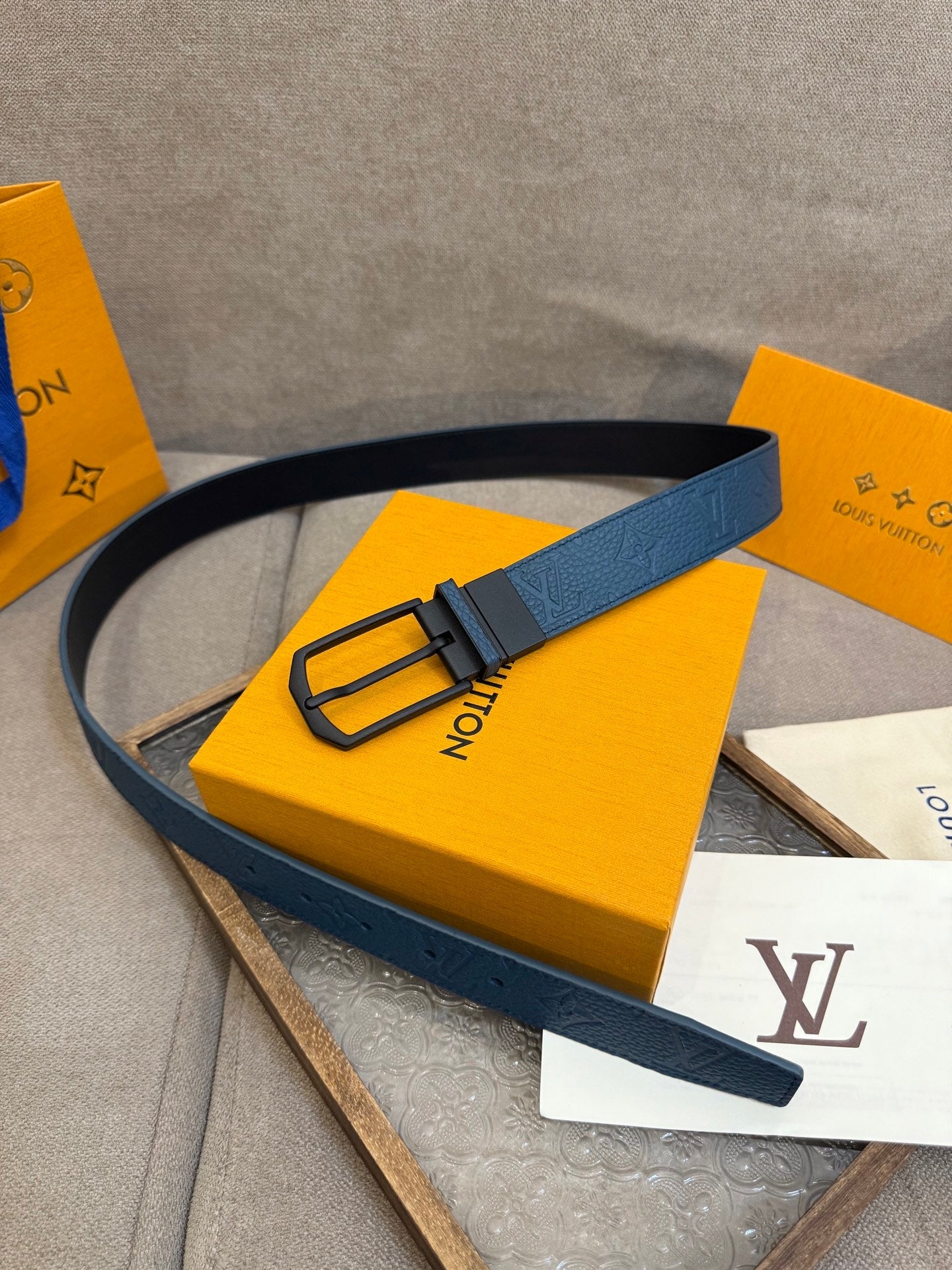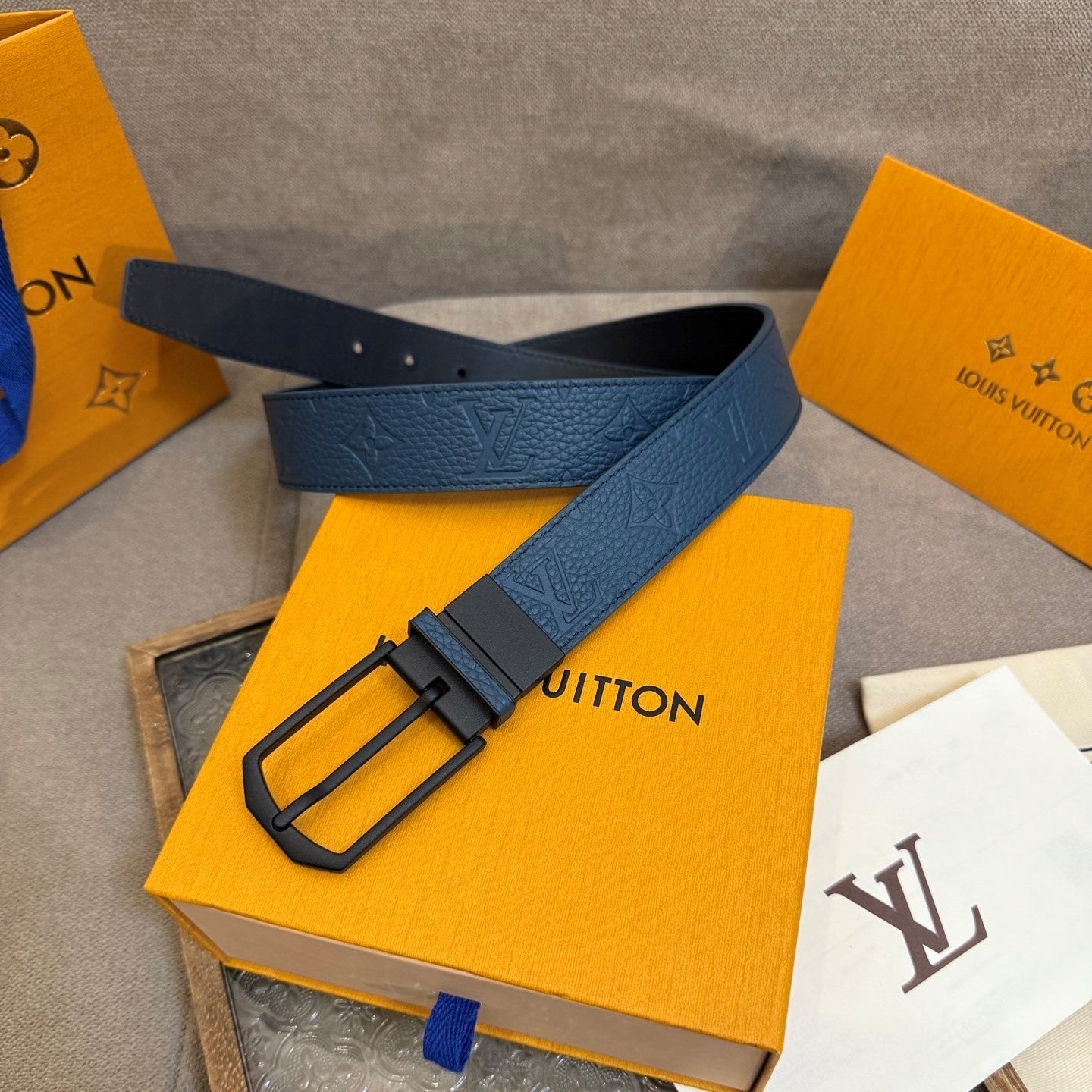 LV Slender Men Belt 35mm Deep Blue Embossed Monogram Leather Black HW
