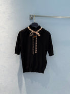 LV 25 Lace Stand-Up Collar Ribbon Short-Sleeved Shirt Black Wool Silk
