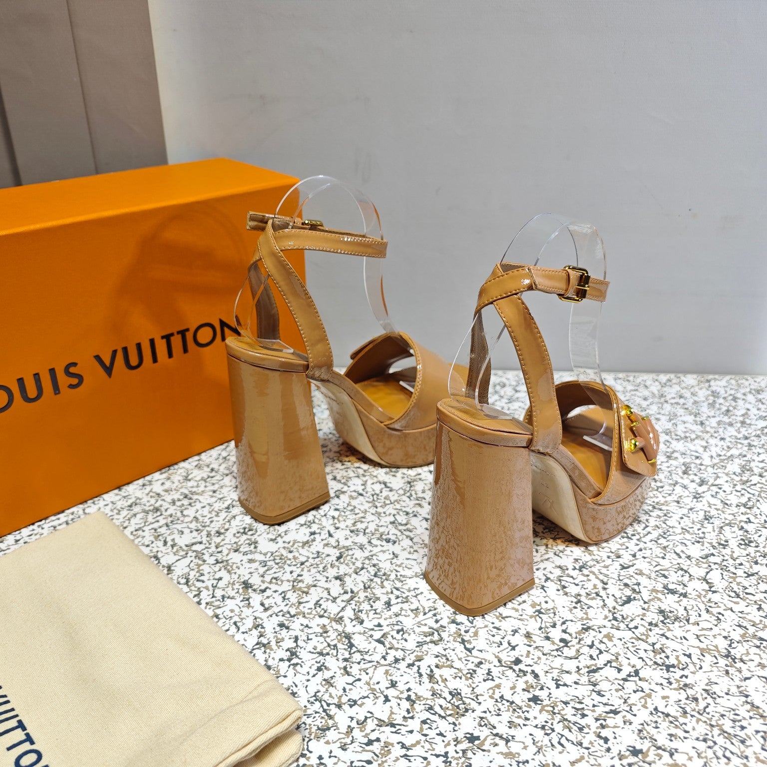 LV Shake Platform Sandal 110mm Taupe Patent Leather 456139