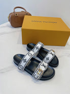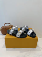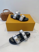 Bom Dia Flat Comfort Mule White Black Monogram Embossed Print Classic 241336