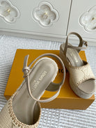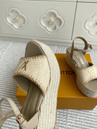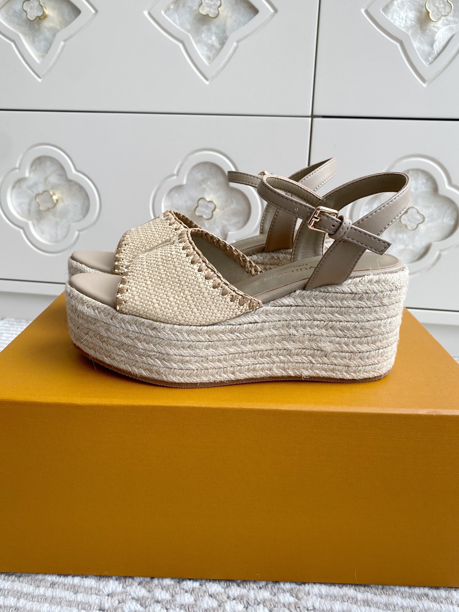 LV Beige·Raffia Straw Wedge Sandals 7.5cm Light Brown Lining Leather 291589