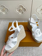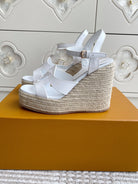 LV Letter Hollow Straw Wedge Sandals 11.5cm White Cowhide 291573